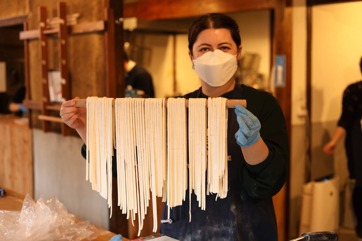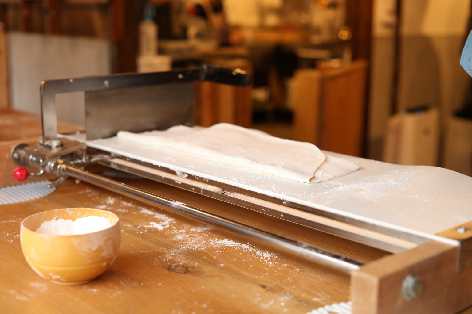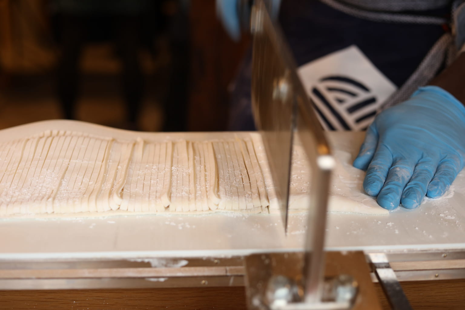 Udon House in Mitoyo, Kagawa, is a charming old Japanese house and it is exactly what it promises – from the moment we stepped in we were treated to warm udon and warm smiles. Staffed by local udon specialists, Udon House offers foodie tours that revolve and twist around the Kagawa favorite. Their udon making lesson starts with a bowl of noodles, so you know what deliciousness you’re aiming for. Next stop is the mixing bowl where you combine flour, water and salt, to make what our instructor lovingly calls “an udon baby”. Kneading it certainly is a good arm workout, but the next step is a literal step and a leg workout. You’re also taught expert rolling out techniques, as well as geometry magic as you turn a circle into a square. The culmination of the noodle creation is when you rhythmically cut the thin dough into stripes.