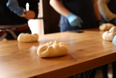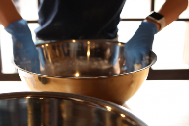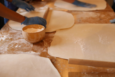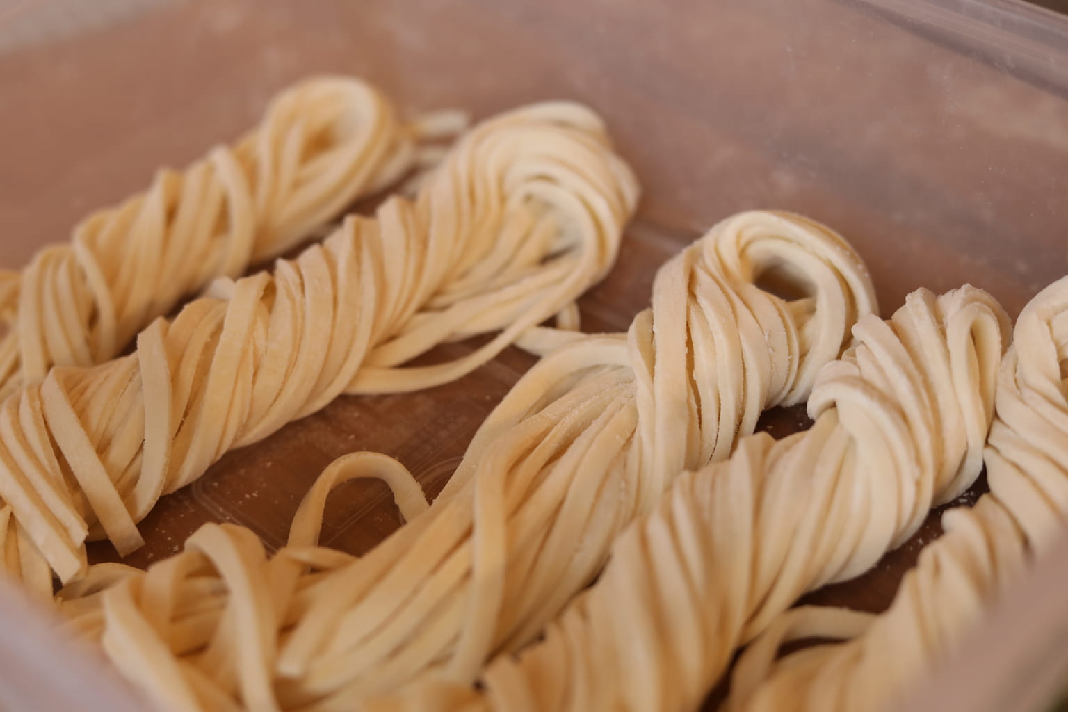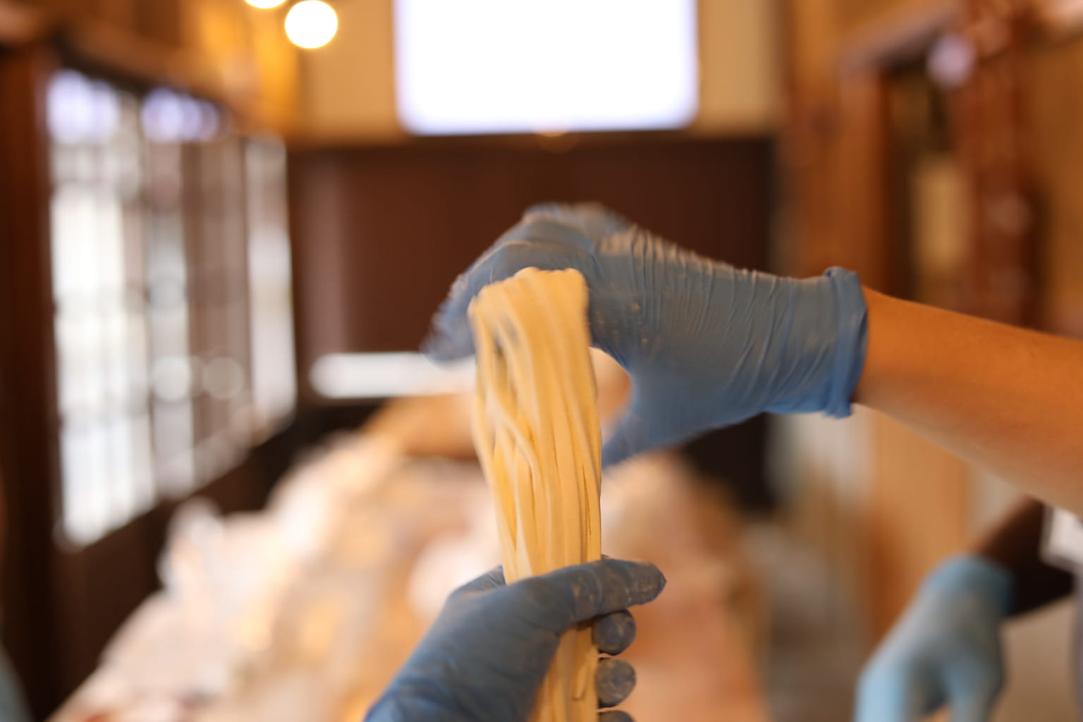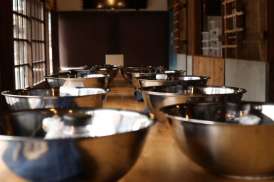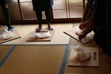 Udon House in Mitoyo, Kagawa, is a charming old Japanese house and it is exactly what it promises – from the moment we stepped in we were treated to warm udon and warm smiles. Staffed by local udon specialists, Udon House offers foodie tours that revolve and twist around the Kagawa favorite. Their udon making lesson starts with a bowl of noodles, so you know what deliciousness you’re aiming for. Next stop is the mixing bowl where you combine flour, water and salt, to make what our instructor lovingly calls “an udon baby”. Kneading it certainly is a good arm workout, but the next step is a literal step and a leg workout. You’re also taught expert rolling out techniques, as well as geometry magic as you turn a circle into a square. The culmination of the noodle creation is when you rhythmically cut the thin dough into stripes.