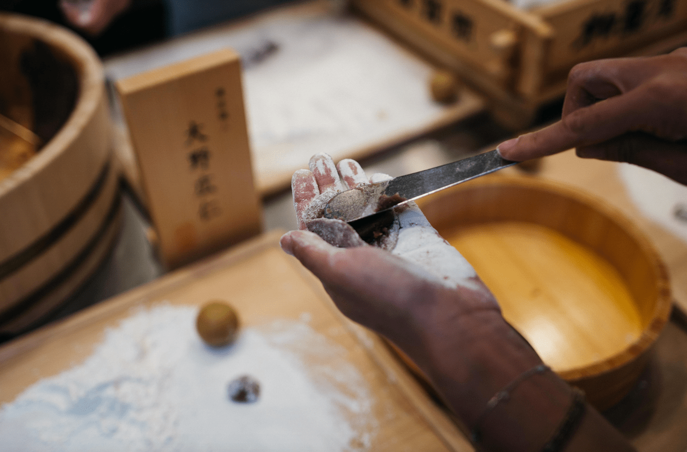 Though we almost had to roll out of the door from there, we weren’t done eating yet. At Kaisei Kashiwaya (1-13-5 Asahi, Koriyama, Fukushima Prefecture, 024-922-5533) we were in for a real treat: making and eating usukawa manju. Fukushima Prefecture is famed for its manju, which has a thin, delicate sugar coating and is considered one of the three great manju in Japan. Ready for a challenge, we rolled up our sleeves and got stuck in with the expert guidance of manju maker Koji Ono, who reportedly can make 20 manju in seven minutes.