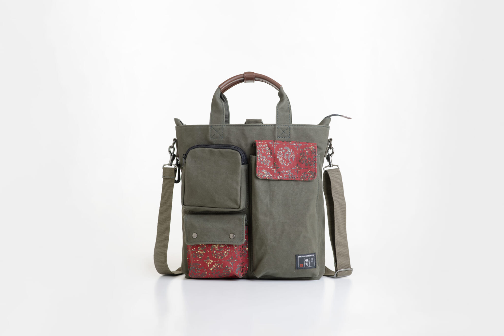 The multifaceted Hinomotohanpu Urushi 3 Way Shoulder Bag from canvas atelier Hinomotohanpu is adjustable to any situation: It can transform into a tote bag, a shoulder bag or a backpack. Its inner compartment can easily carry your laptop and A4 files while the three utility pockets of different sizes on the front of the bag are perfectly designed to hold accessories such as computer cables, folding umbrellas and other essentials.