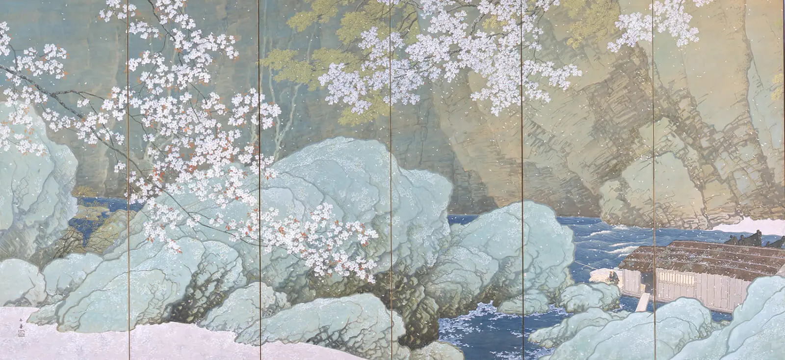 Cherry-picked from the museum’s assortment of invaluable artworks, the exhibition consists of eight spring-themed Japanese-style paintings, folding screens, hanging scrolls and a kimono. A must-see piece is “Parting Spring” (1916) by Kawai Gyokudo, a folding screen portraying fallen cherry blossom petals drifting softly on Saitama Prefecture’s Nagatoro Gorge. The masterpiece was designated as a National Important Cultural Property in 1971, acclaimed for its sublime depiction of a gradual seasonal transition, the motion of flowing water and local life.