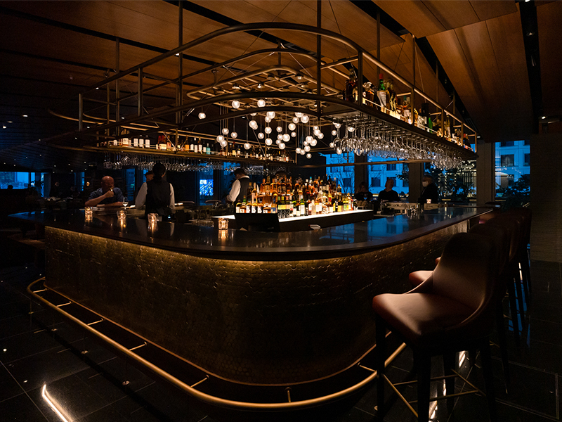 Yoshimoto says the club’s striking walnut, pitched ceiling, basalt feature walls, custom-made carpeting and curated artworks are intended to imbue the space with style and warmth.  “One of the key points around the club is creating an atmosphere of what I call ‘urban sophistication,’” says club member Terry White. Nowhere else is this truer than in the bar area. Set in front of floor-to-ceiling windows, the bar’s wood-and-brass aesthetic, complete with pendant lights, footrails and an illuminated central liquor display, is sure to catch more than a few eyes. “We want this to be the wow factor,” Yoshimoto says.