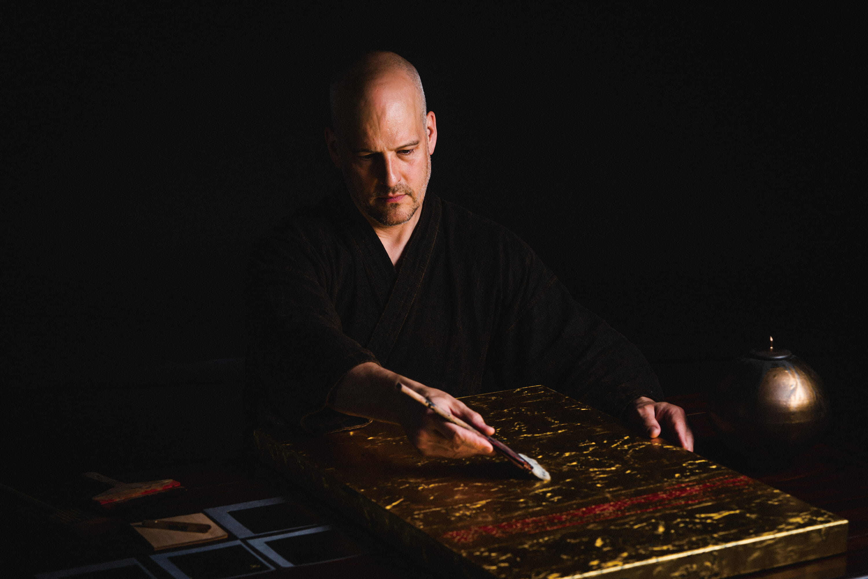 Eventually, Hewett transitioned to working on canvas and wood. His work retains a deep connection to the original form; many of the pieces in the Bushido series are separated or segmented in a way that’s directly inspired by byobu screens. “In my abstract work, there are a lot of references to traditional themes,” he notes. “I’m pulling out themes in terms of subject matter, but also in terms of technique.”