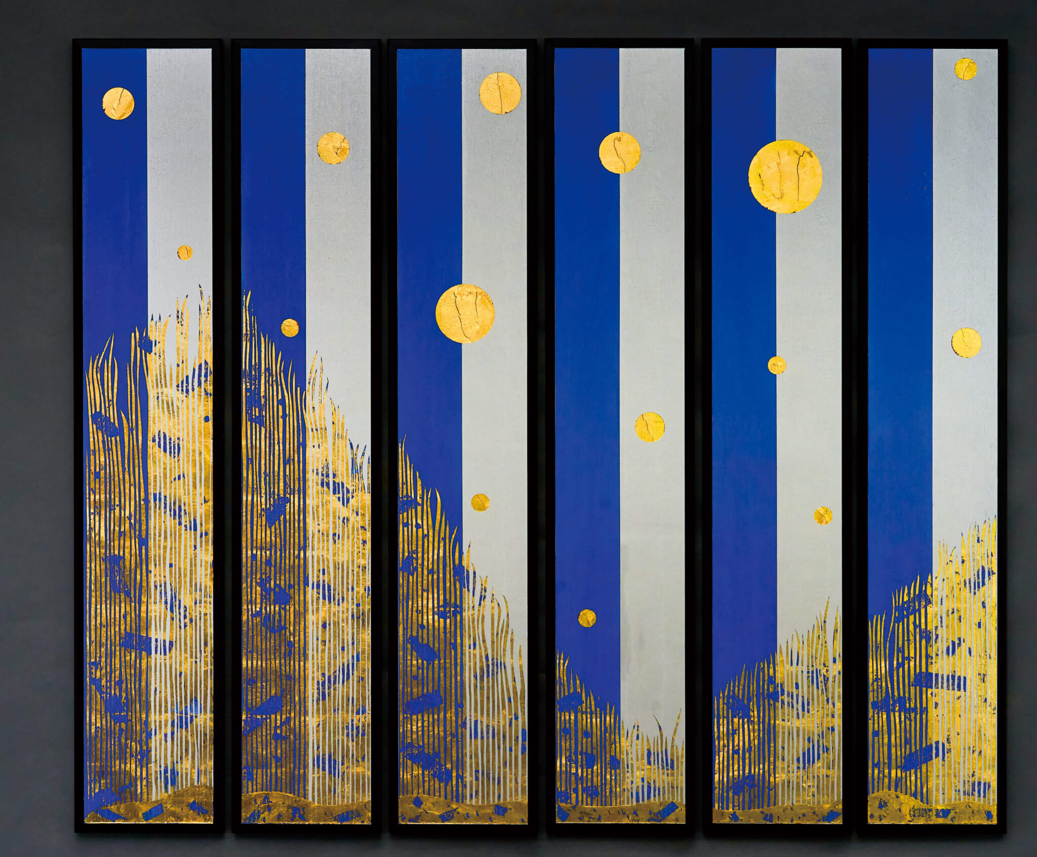 A serendipitous encounter with Japanese byobu (traditional folding screens) at the Mitsui Memorial Museum in the early 2000s would alter the course of Hewett’s career. The screens on display, dating from the 12th to 14th centuries, were missing much of their original pigment, making their subject matter hard to distinguish. Yet, as Hewett recalls, their luminescent gold leaf backgrounds had remained intact.