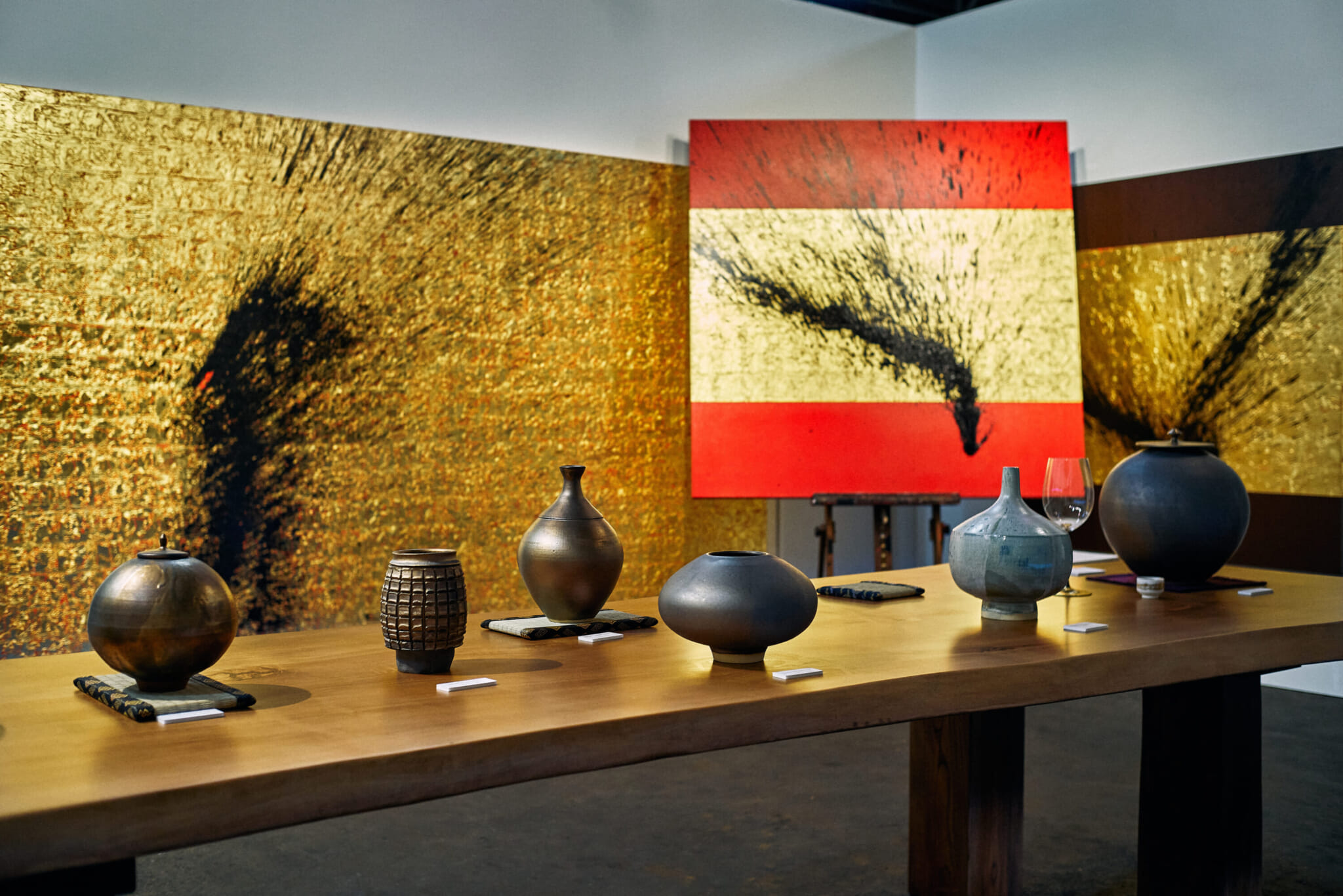 Now based in the tranquil, mountainous town of Karuizawa, Hewett arrived in Japan in the late 80s to study ceramics. He has since developed an original style of pottery, which is but one facet of his prolific oeuvre. He’s perhaps best known for the Bushido series: large-scale paintings featuring carefully applied Kanazawa gold leaf topped by dramatic, inky swooshes of thrown paint, inspired by a laborious study of history and traditional Japanese screen-making.