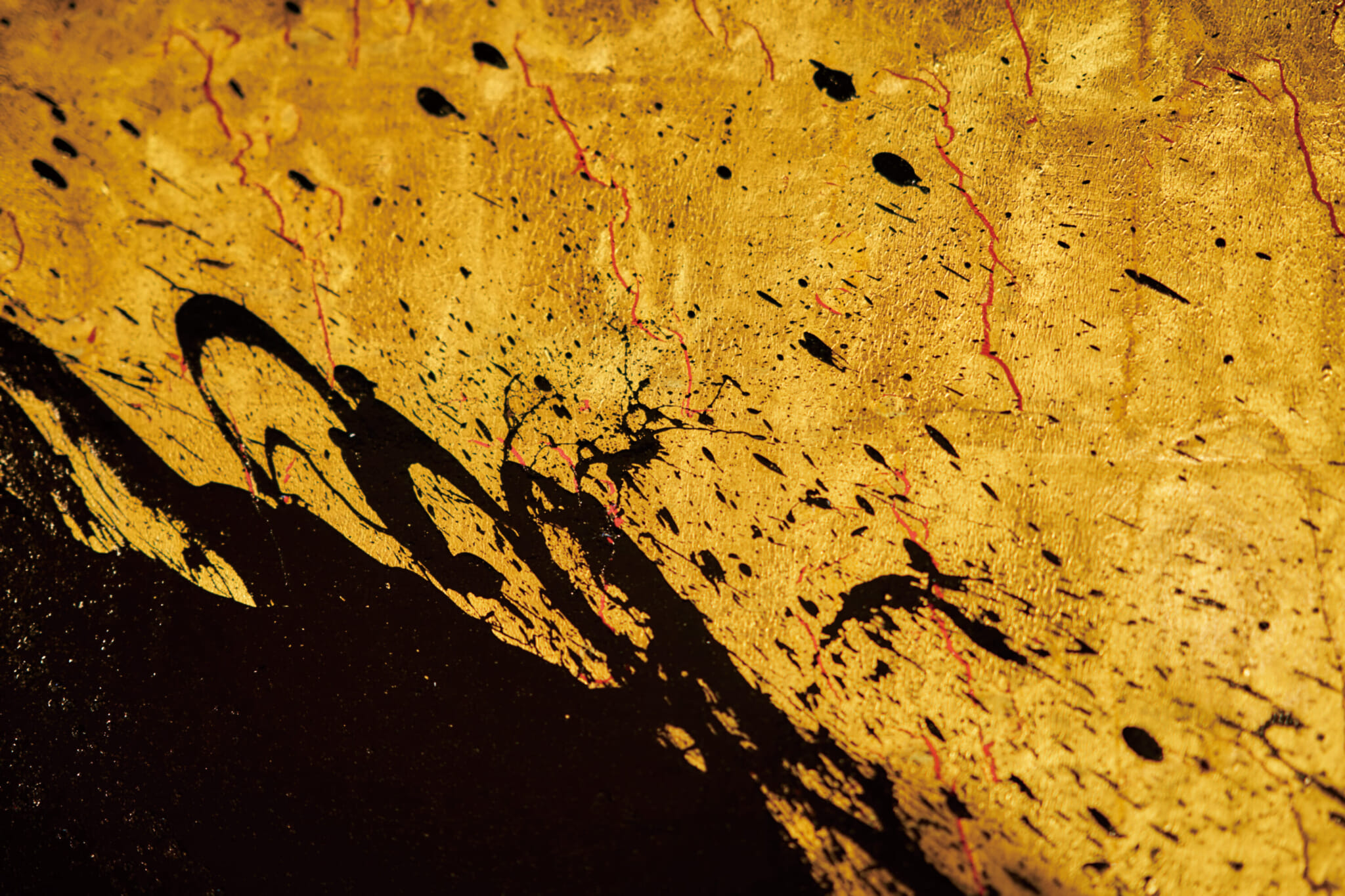 This “moment of revelation,” as he calls it, is often literalized in the Bushido paintings by a splash of dark paint, thrown boldly across a gleaming, painstakingly realized gold leaf surface. There is, as Hewett notes, no room for error. As he marks the canvas with a decisive swing of his arm, the calligraphy brush in his hand resembles a sword.