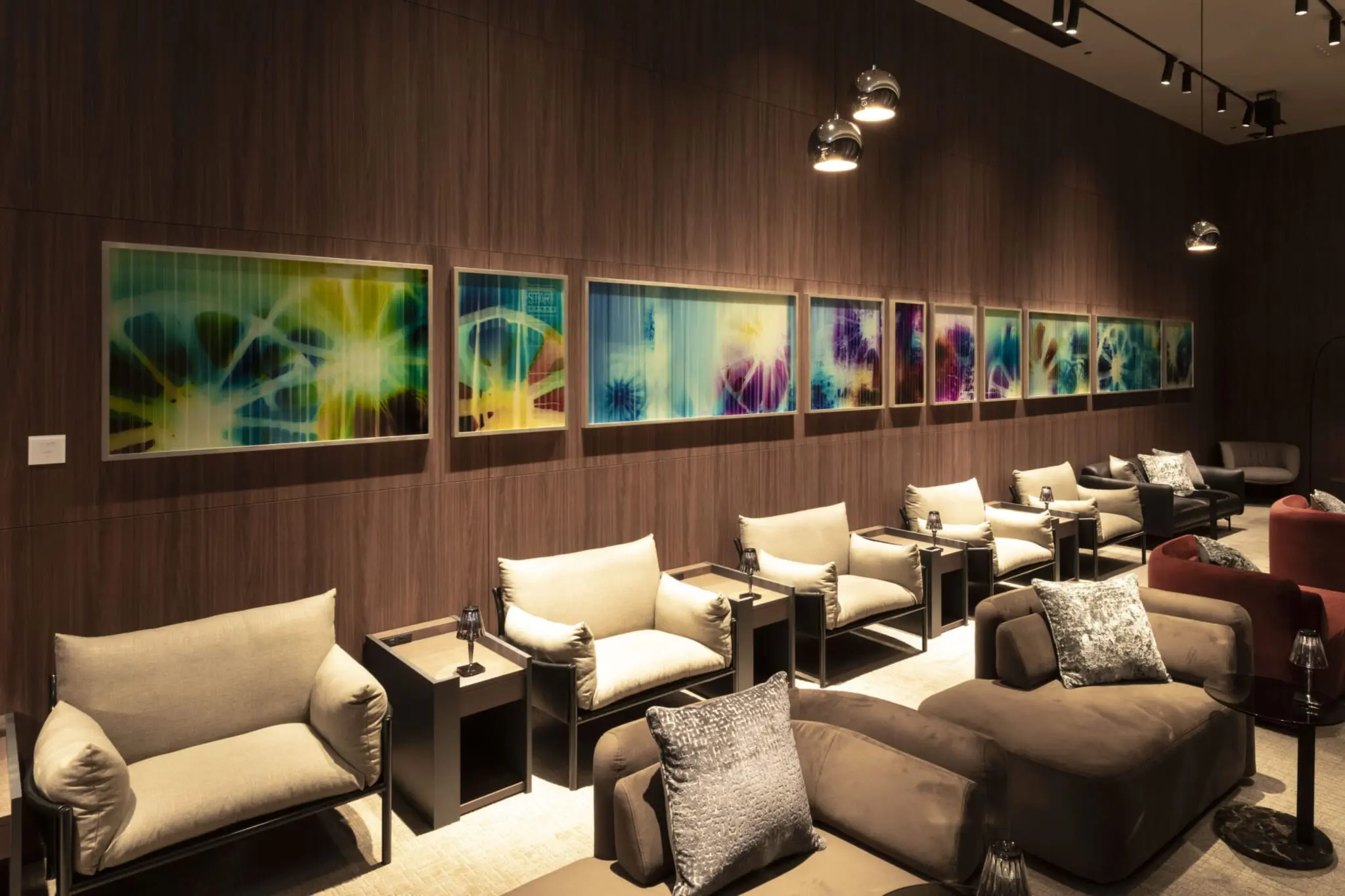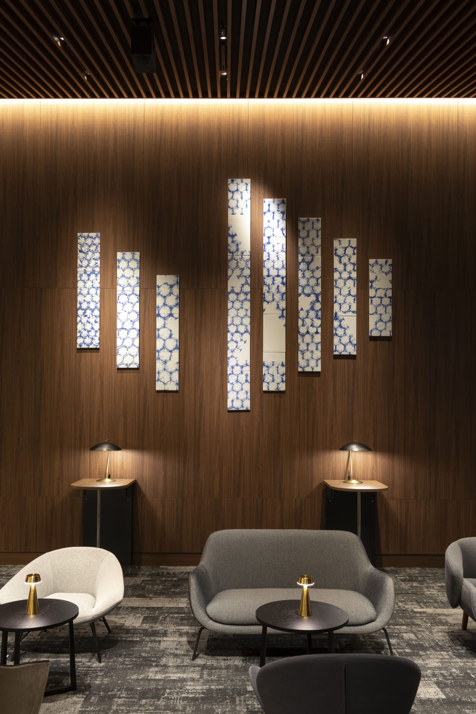 The walls of both lounges and the reception area are adorned with curated art pieces, all of which reflect a love for cinema or the iconic neighborhood in which the theater is located — including one work that uses 35mm film, and another which utilizes traditional dye-printing techniques to pay homage to the metropolitan scenery of Shinjuku. Additionally, the far end of the lounge has large windows that overlook the Cine City Square.