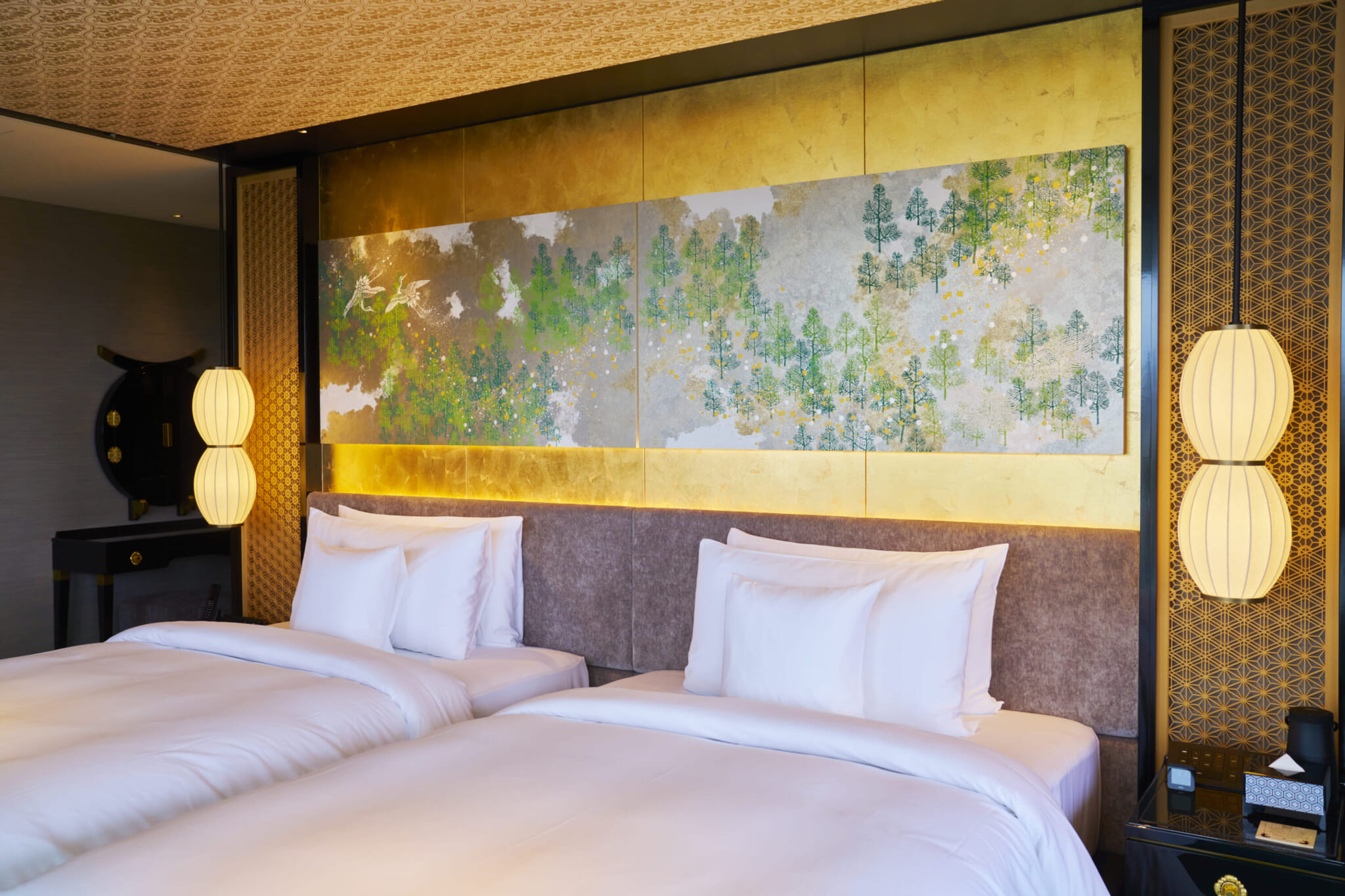 The halls and dining spaces are adorned with striking homages to Japanese motifs, mythology and seasonal beauty — a sleek white dragon rendered on canvas in plaster, gilded screens depicting pine trees and bamboo forests, intricate wood carvings of auspicious animals. This sense of studied and careful design continues in each room, particularly the suites and Art Collection rooms.
