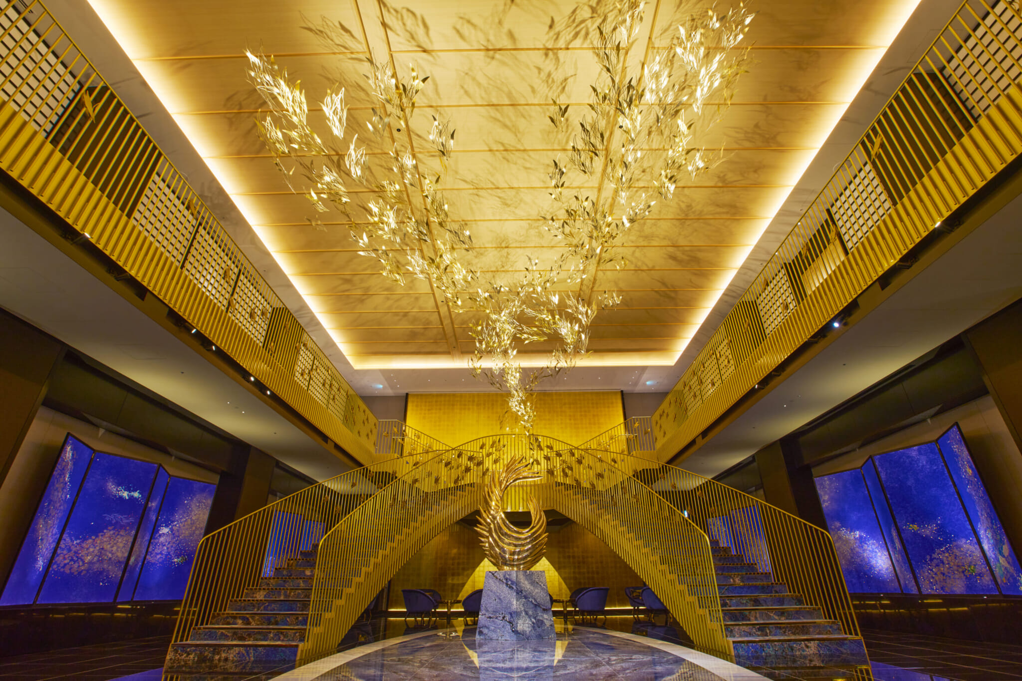 Works that reference the concept of “Rin-Poh-Ki-Ryu” appear throughout the hotel. In Japanese, the term is a shorthand for kirin, phoenix, tortoise and dragon deities — all traditionally believed to bring good fortune and signal times of peace. Along the staircase of the main entrance, you’ll find an enormous mural by the renowned kimono designer Jotaro Saito depicting these four divine beings.