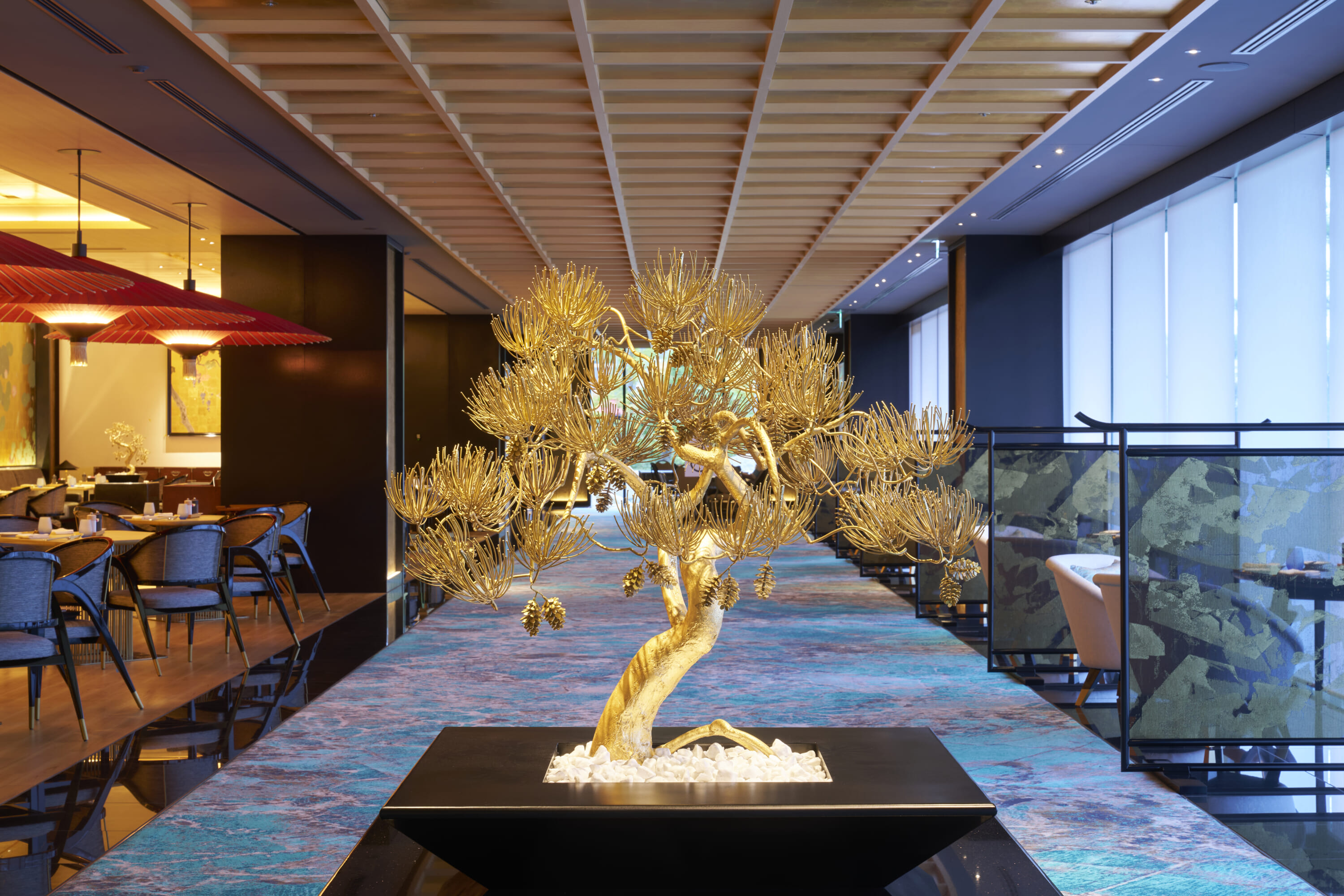 The halls and dining spaces are adorned with striking homages to Japanese motifs, mythology and seasonal beauty — a sleek white dragon rendered on canvas in plaster, gilded screens depicting pine trees and bamboo forests, intricate wood carvings of auspicious animals. This sense of studied and careful design continues in each room, particularly the suites and Art Collection rooms.