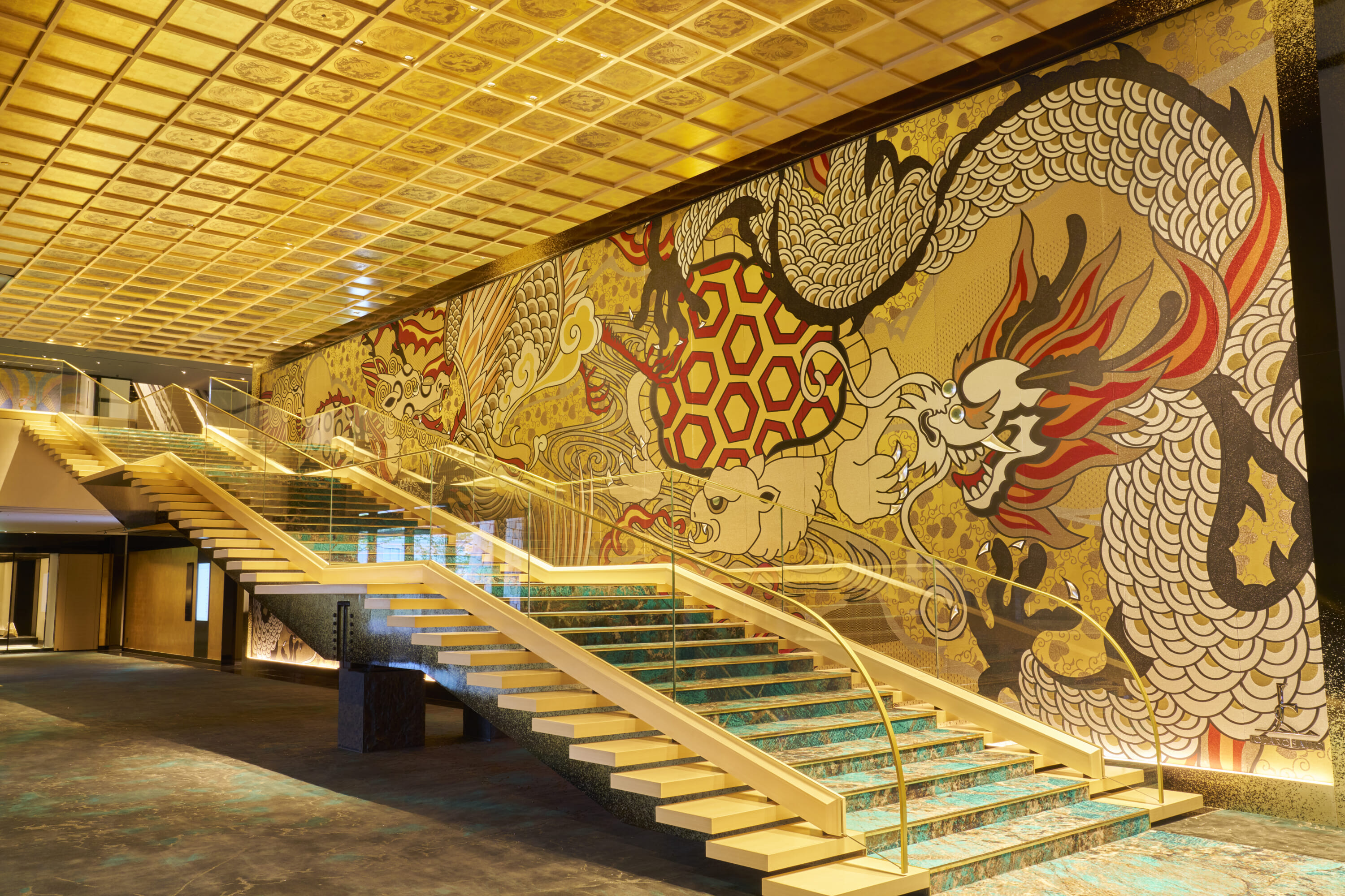 Works that reference the concept of “Rin-Poh-Ki-Ryu” appear throughout the hotel. In Japanese, the term is a shorthand for kirin, phoenix, tortoise and dragon deities — all traditionally believed to bring good fortune and signal times of peace. Along the staircase of the main entrance, you’ll find an enormous mural by the renowned kimono designer Jotaro Saito depicting these four divine beings.