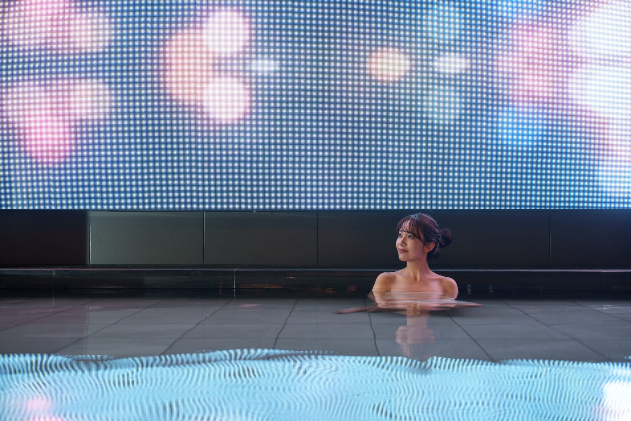 One of the highlights at Cross Life Hakata Tenjin is its large public bath, along with a steam sauna for women and a dry sauna for men. The bath has its own custom digital art display with the theme of “natural healing”; guests can unwind in the soothing waters while enjoying video art of various natural phenomena — a forest, a skyscape, flowing water — slowly changing over time.