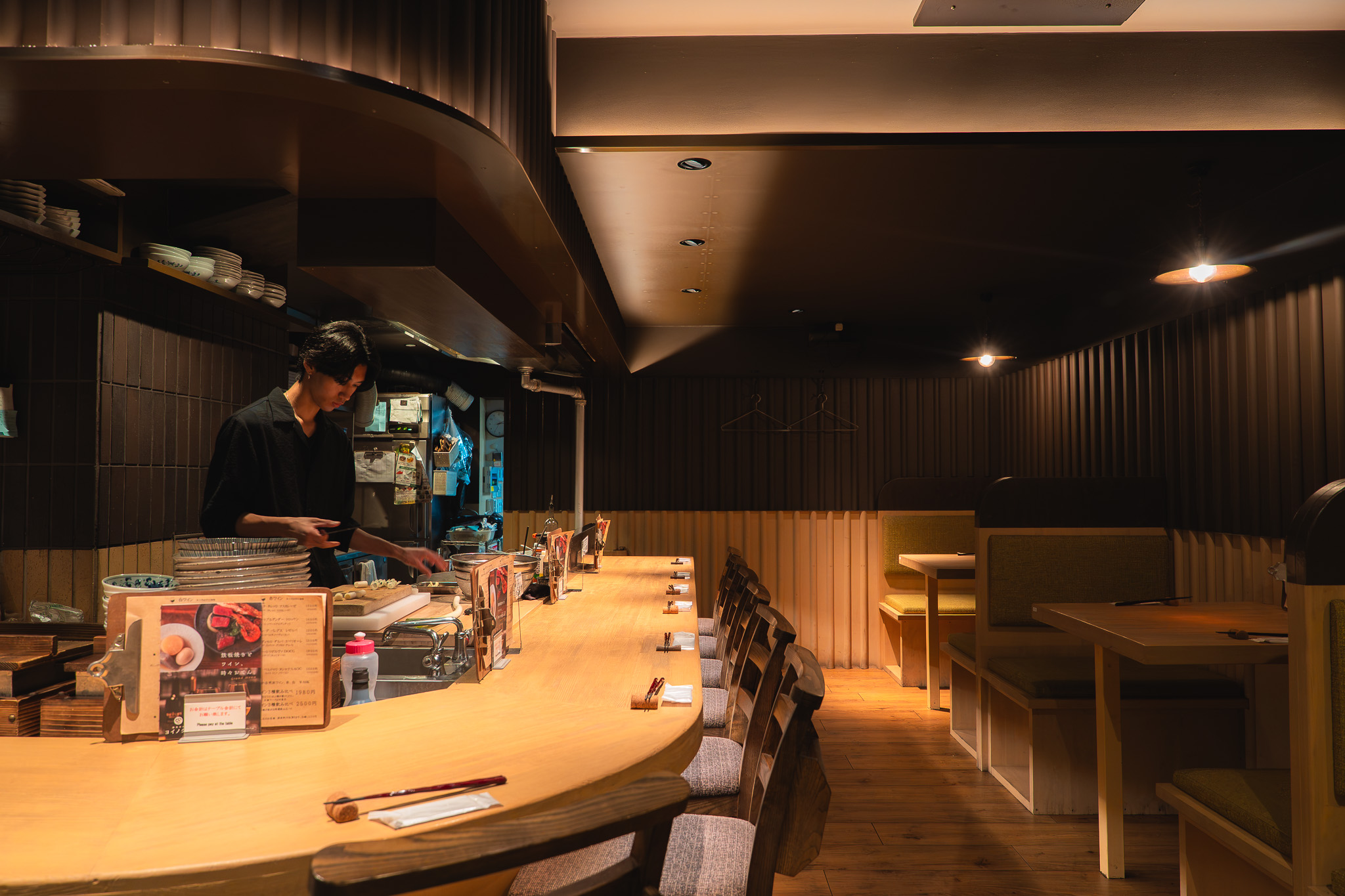 The space centers on counter seating, letting guests watch the chefs at work, while a few tables provide a cozy spot for friends or solo diners.