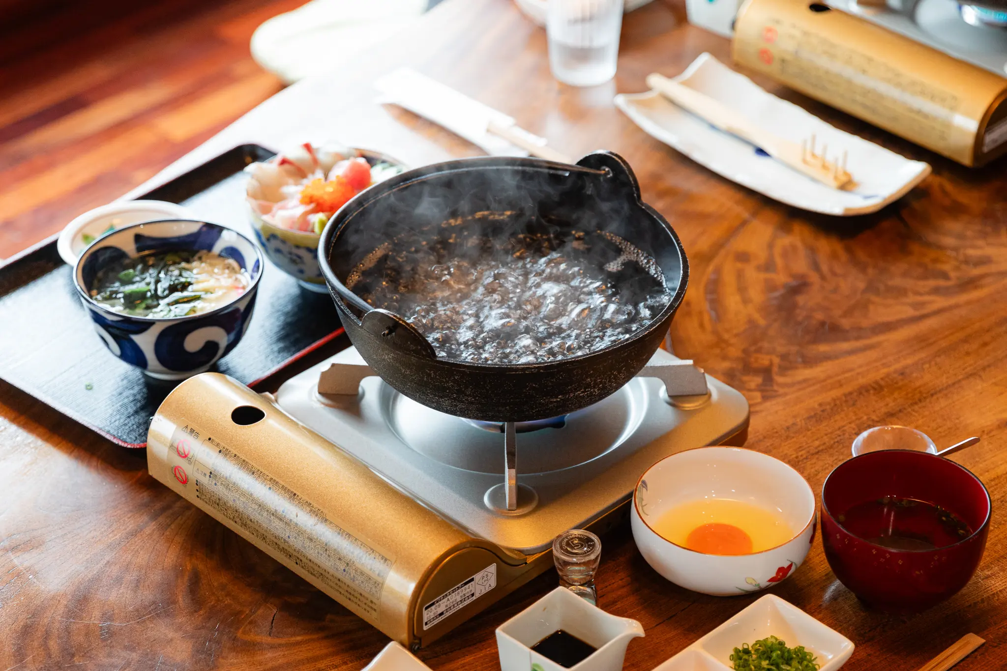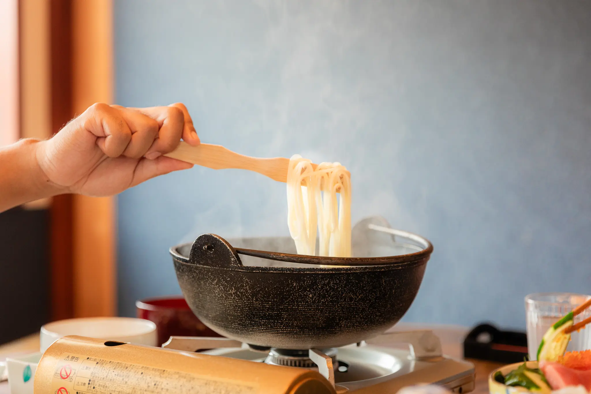 Even if Tsushima isn’t where the history of soba began, the island is definitely where the noodles reached delicious heights with the creation of iriyaki soba. Normally, soba is a simple dish born out of necessity and survival. Iriyaki soba, on the other hand, is served in a rich hot-pot broth made from local chicken and plenty of vegetables like shiitake and burdock. When the broth is paired with the earthy and chewy noodles, the savory and fresh flavors and textures work together to create a delicious dish that captures the very essence of Tsushima.