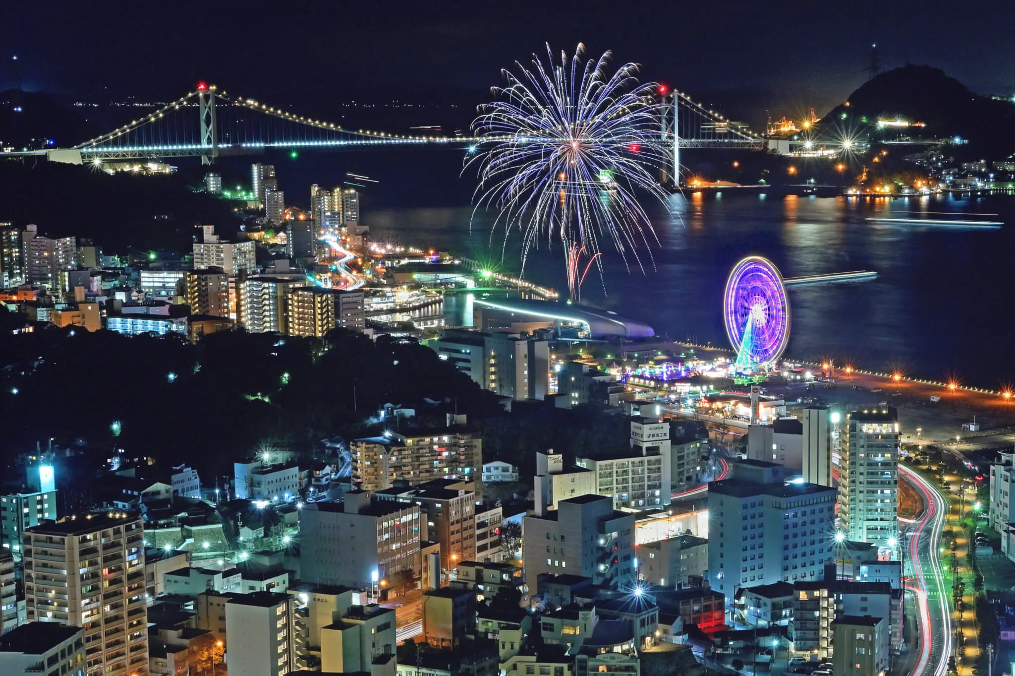 Additionally, every year on August 13, the Kanmon Straits Fireworks Festival is held from both sides of the illuminated Kanmon Bridge. It’s an incredibly unique event, with 15,000 fireworks launched over the sea from two separate prefectures — Yamaguchi Prefecture on Honshu and Fukuoka Prefecture on Kyushu. Unfurling against the beautiful night scenery of the Kanmon Straits, the competing fireworks displays create a mesmerizing visual experience, bringing people together in awe and celebration.