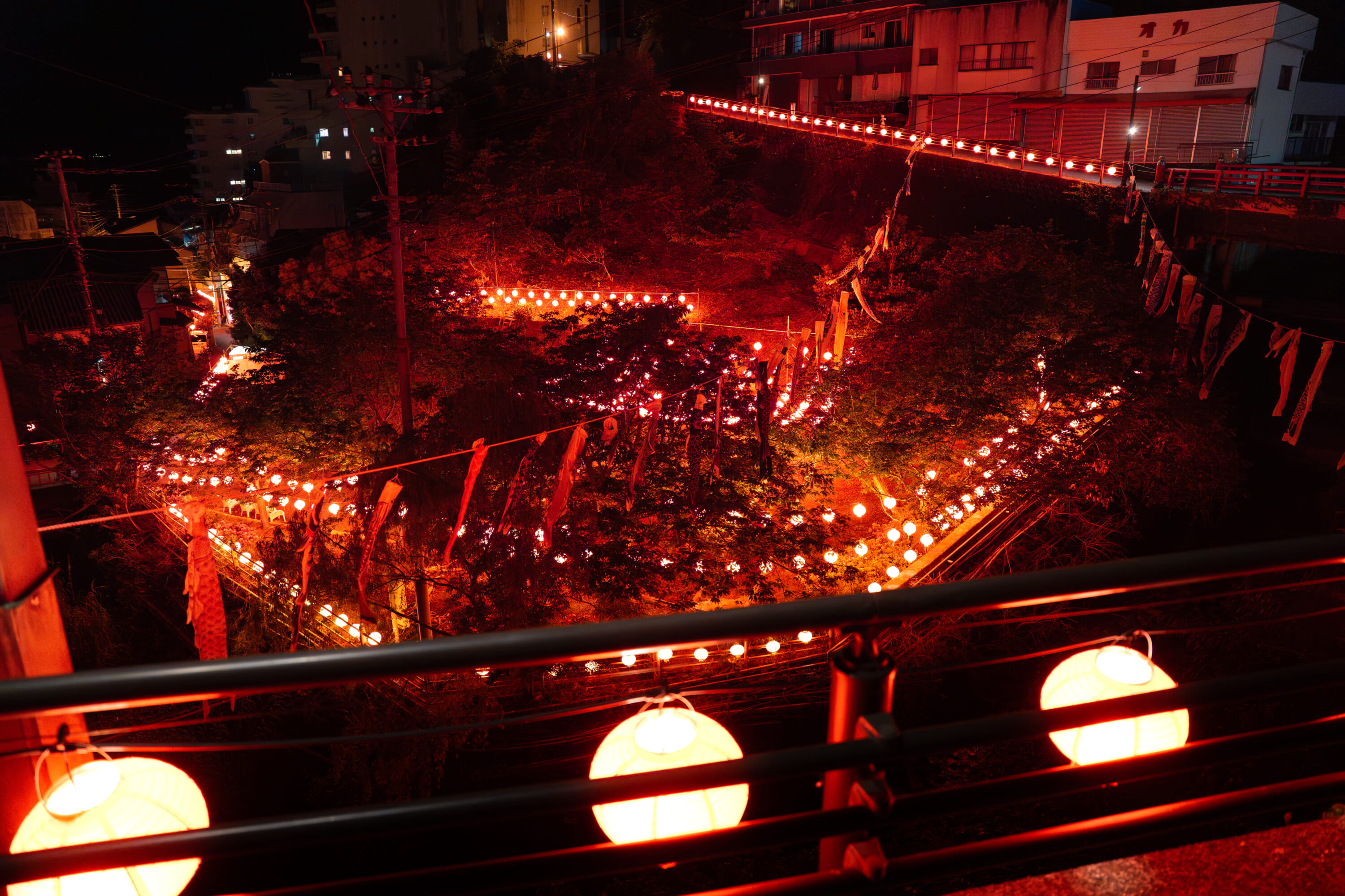 At night, the Atagawa Onsen area transforms into something straight out of a Studio Ghibli movie. Its streets are lit up with the enchanting red glow of paper lanterns: hanging in rows outside local izakaya, fluttering at the entrance of shrines and twinkling across the town’s many red bridges. Paired with the curls of steam and the sounds of crashing waves, they create an intoxicating and ethereal atmosphere.