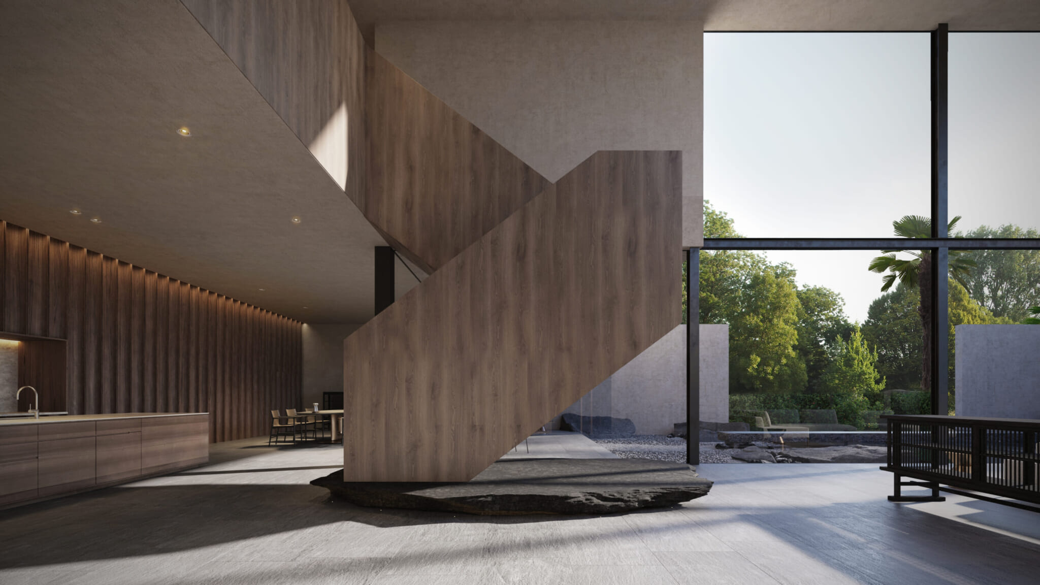 Saruta believes Zen, which he defines as “mindful serenity,” remains alive today in Japanese expressions of beauty and in classical arts like the tea ceremony; it’s something he strives for in his own practice. As a native of Matsumoto, a city famous for its black castle and monochrome townscape once inhabited by samurai and craftsmen, he is no stranger to the Zen ethos. “I think that’s where a lot of my personal style comes from: the spirit and aesthetics of Matsumoto … I’ve been told it’s unconventional for an architect to favor large slabs of black materials like stone, as I do.”