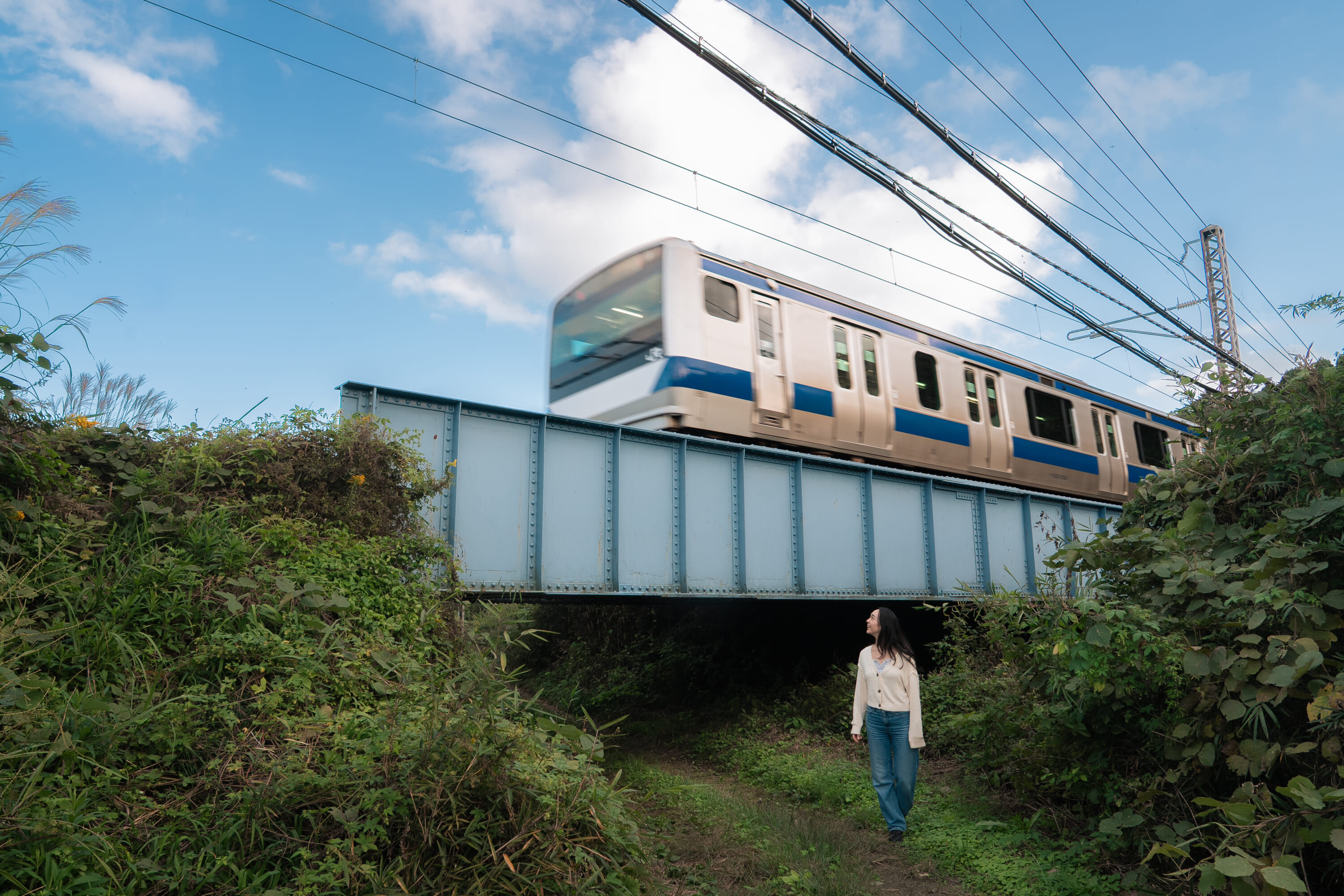 Continue along the path to find the iron bridge of the Joban Line, where if you time it just right, you can watch the local train pass directly overhead, closer than could ever be possible in the crowded city.