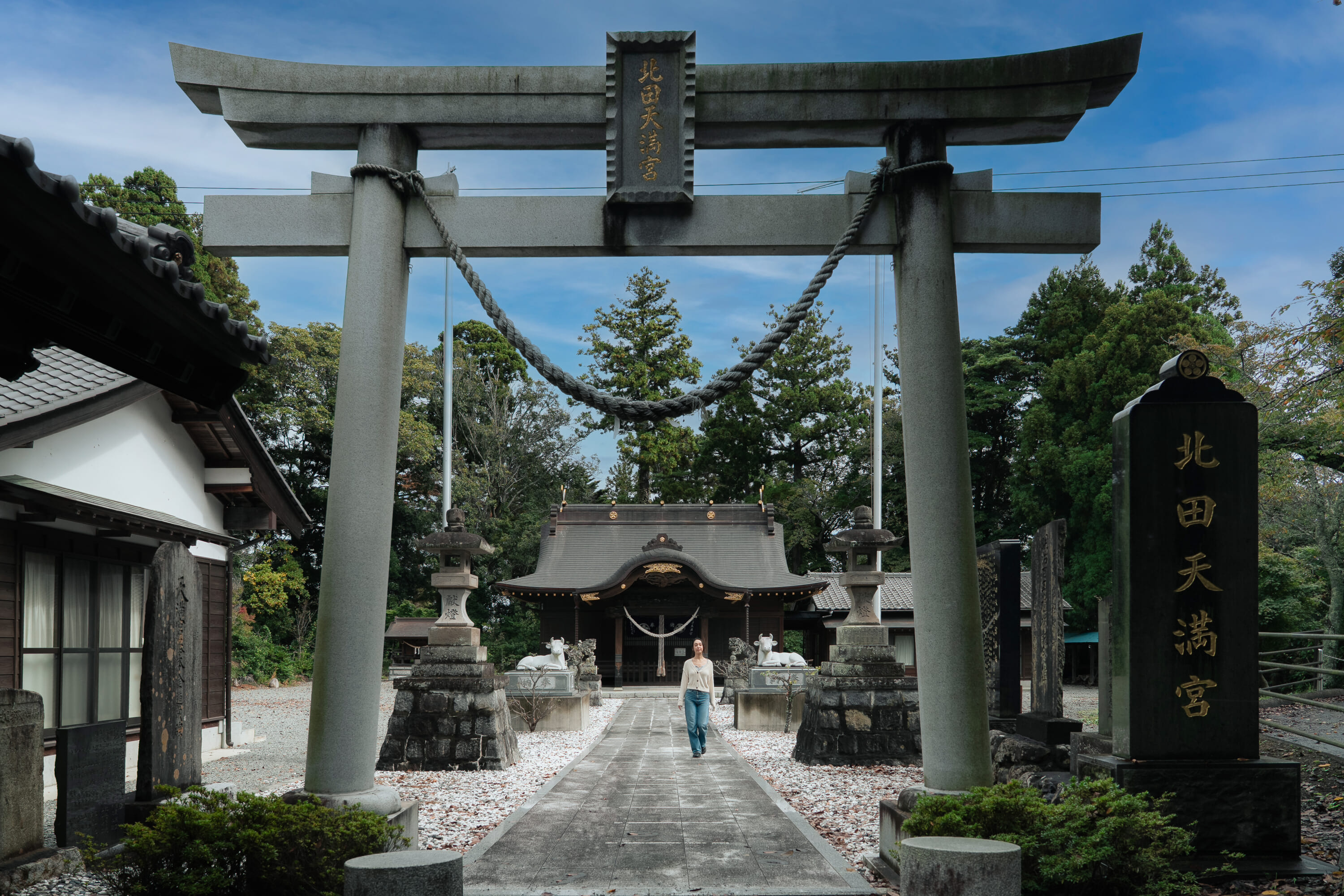 Continue through the cherry tree-filled path to arrive at Kitada Tenmangu Shrine. Dedicated to the god of learning, it’s a place where students come to pray before exams, and where the community gathers in early spring for luxuriously private cherry blossom-viewing. After paying respects, continue on the path to the impressively large red torii gate, a striking backdrop for a moment of reflection and photos.