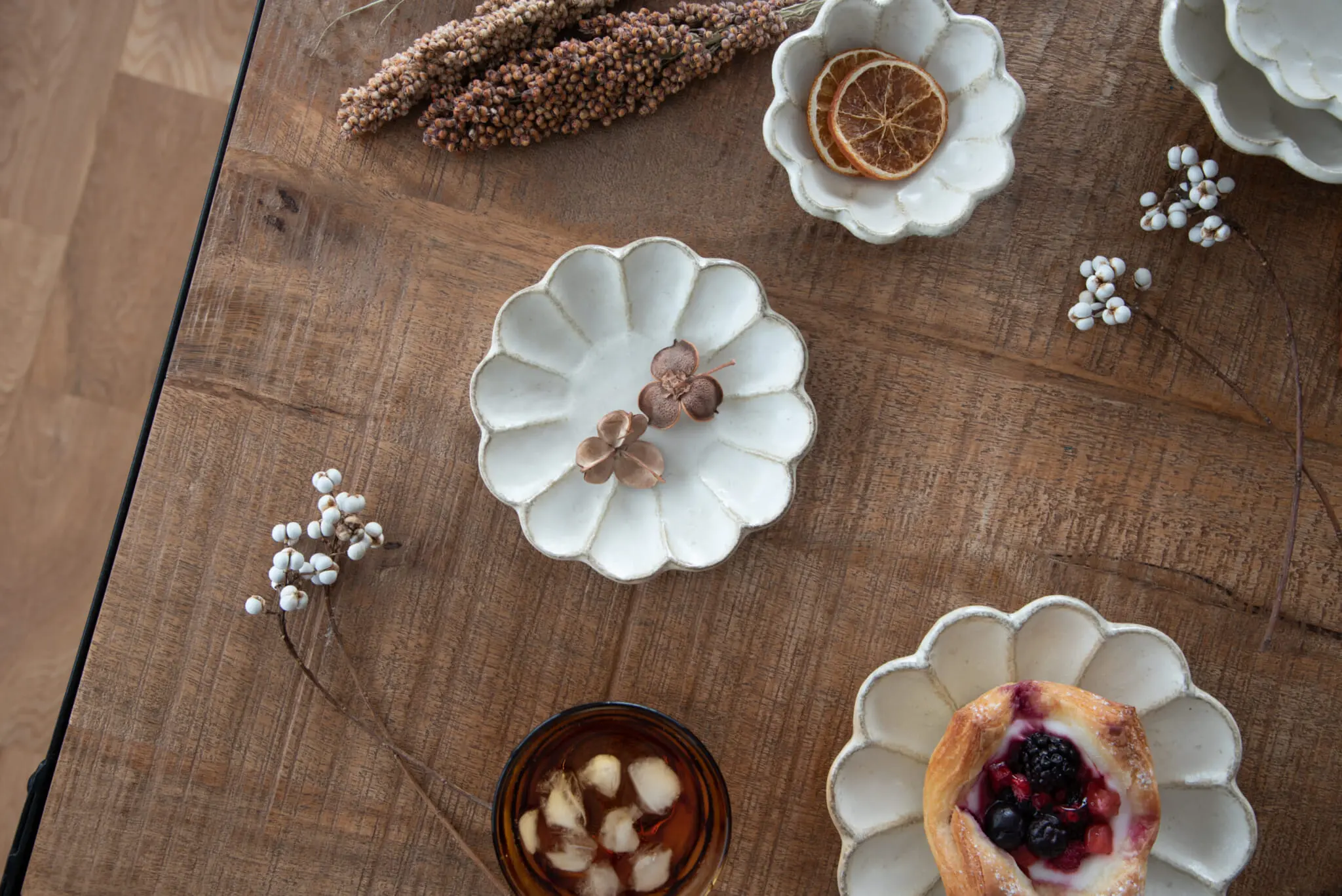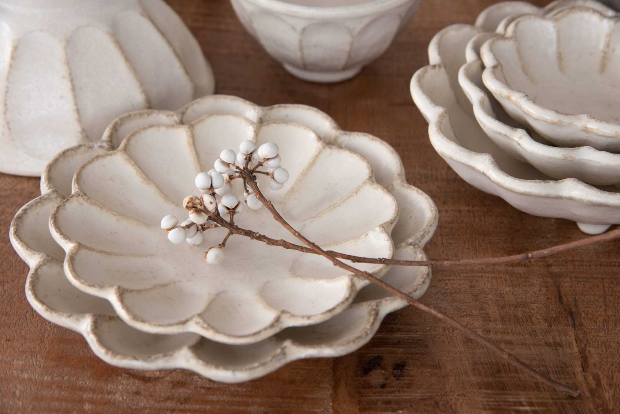 Part of the ceramic range sold by Yamani, a Japanese tableware company, this petal-rimmed, off-white, textured plate will imbue any table with a nostalgic elegance. Suitable for both dishwasher and microwave use, this porcelain can be used in all manner of circumstances: as a pretty dessert plate, a means for offering snacks or even a saucer for an accompanying cup. The versatility of this piece, as well as its durability, makes it an appealing choice even beyond its aesthetic appeal.