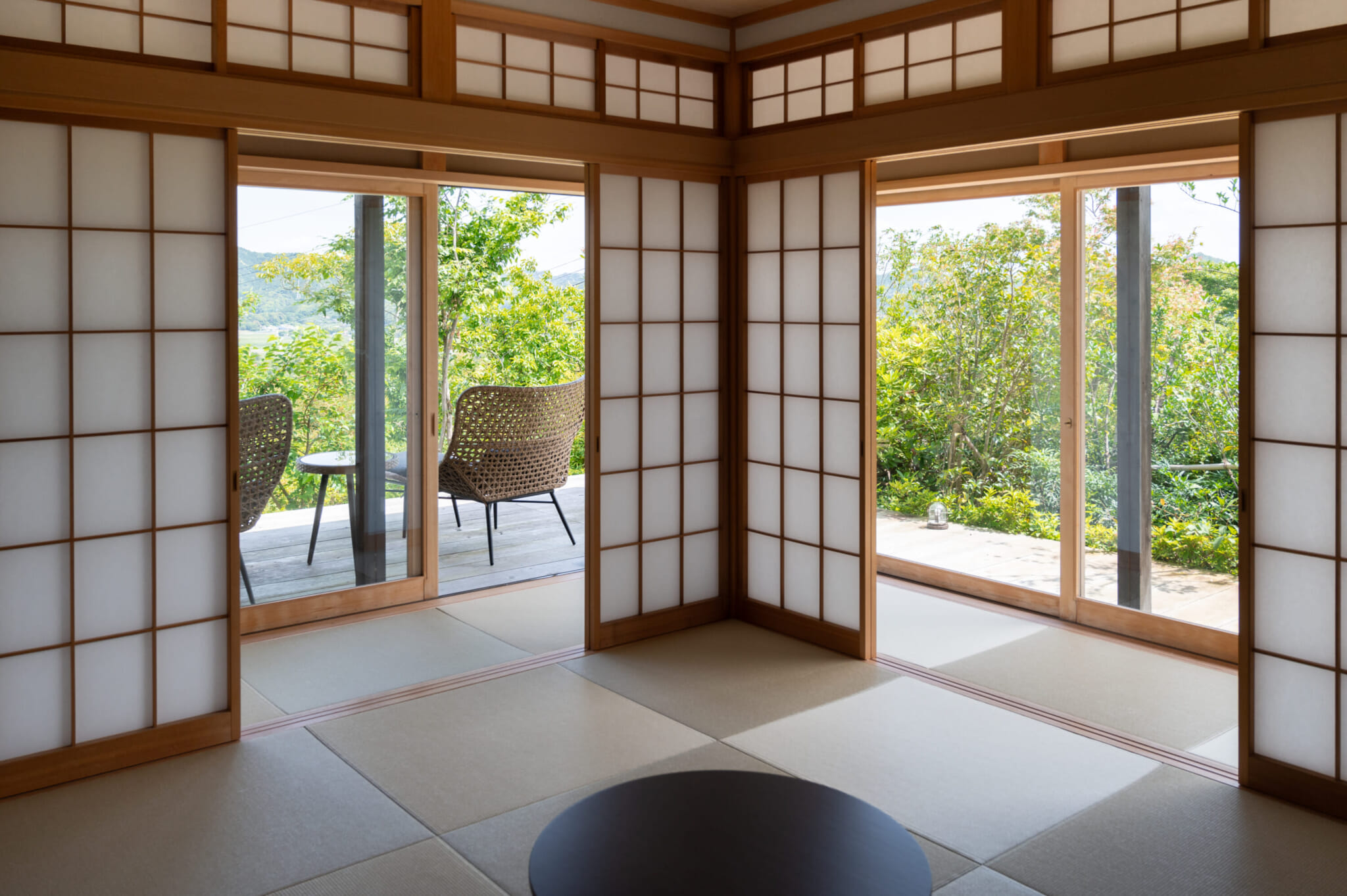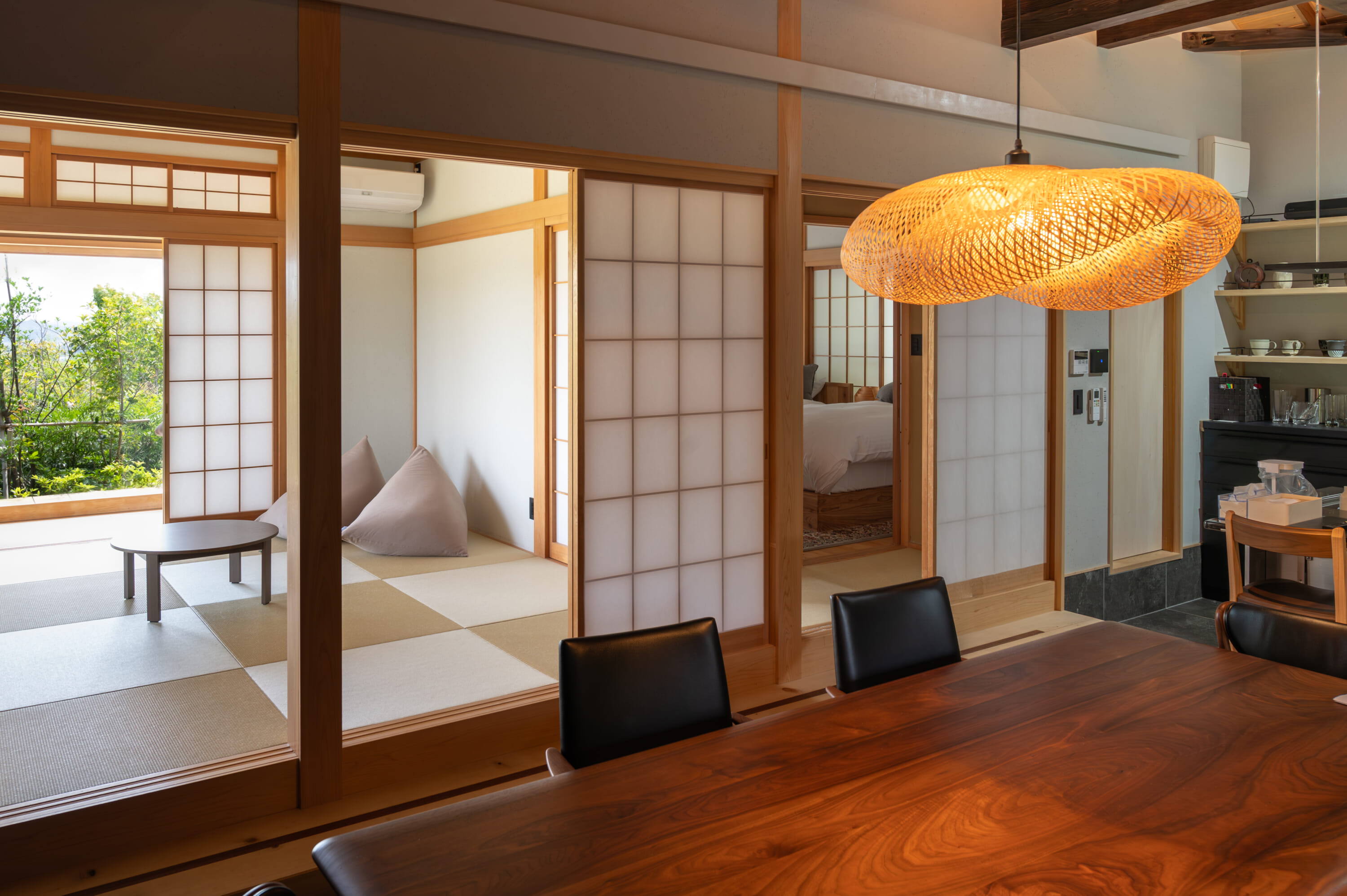 Unwind in the harmonious fusion of Japanese and contemporary aesthetics within the spacious tatami dining area, where the warmth of a wood-burning stove creates an inviting ambience. Head outside to the wood deck to savor the panoramic views of the Kamogawa landscape and the distant Pacific Ocean before immersing yourself in the semi-outdoor bath, where the soothing sounds of nature provide a therapeutic escape from the bustle of city life.