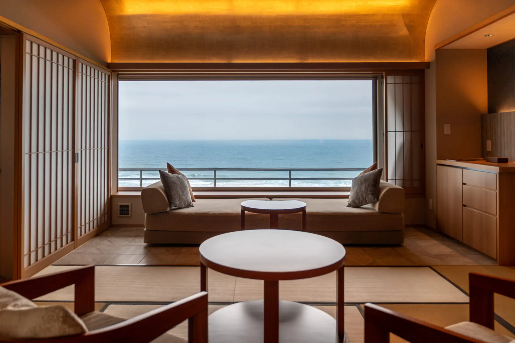 Fall into the tranquil embrace of Kamogawakan, where many rooms overlook the vast expanse of the sea — and every room is an oasis. With meticulously designed accommodations tailored to your preferences, there is a room for every desire. Those seeking a spectacular view should book a space on the eighth floor, where panoramic windows frame the ocean like a painting, inviting endless moments of serenity. Seating by the window ensures uninterrupted views, allowing you to lose yourself in the beauty of the ocean beyond.