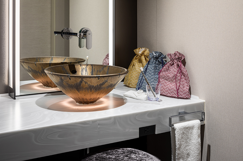 This refined and calm atmosphere continues into the guest rooms, which are equipped with thoughtful details like Edo Kiriko-inspired design motifs and Japanese-style ceramic washbasins.