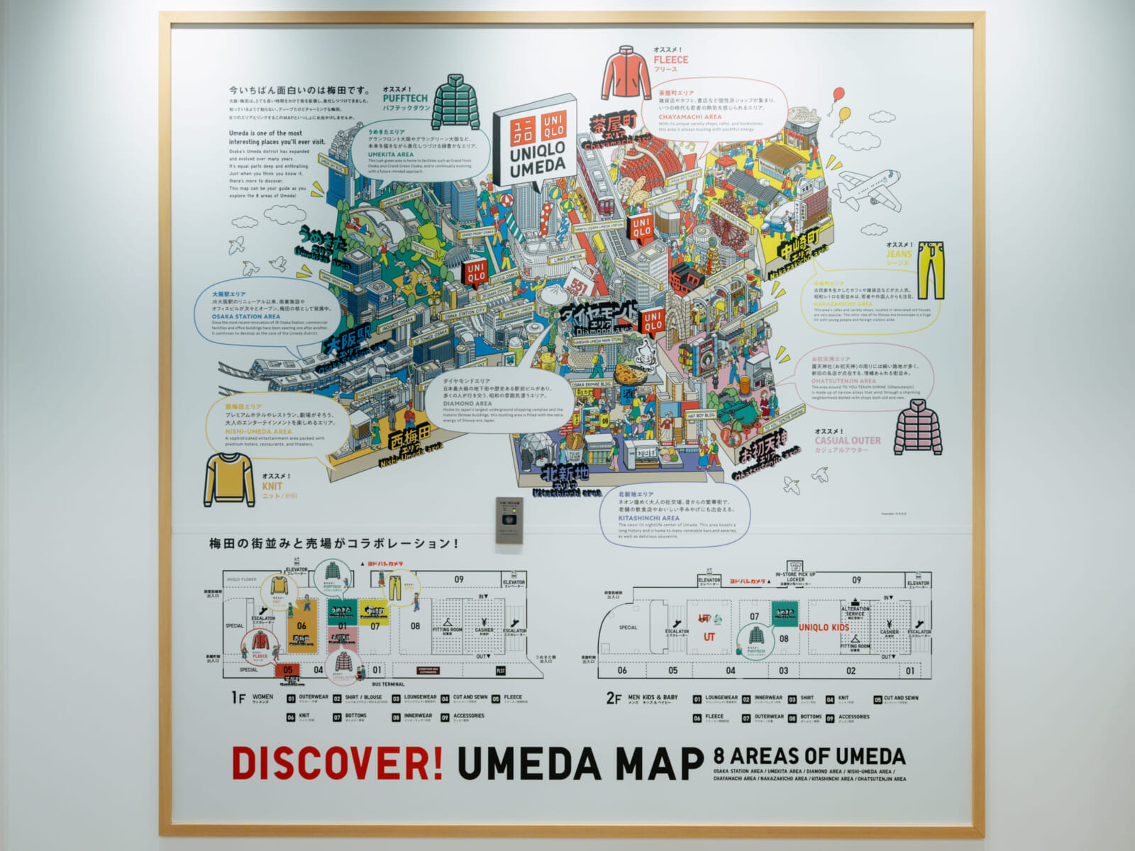 Additionally, to celebrate the opening, Uniqlo Umeda is releasing a special “Discover! Umeda Map,” a guide designed to help visitors explore the neighborhood around the store. The map divides Umeda into eight distinct zones — Umekita, Osaka Station, Chayamachi, Nakazakicho, Ohatsu Tenjin, Kitashinchi, Diamond and Nishi-Umeda — and highlights popular sightseeing spots, dining destinations and new areas undergoing redevelopment. Available in both Japanese and English, the map offers a handy introduction for travelers eager to experience one of Osaka’s most dynamic districts.