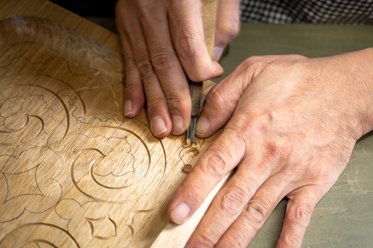 Swirling morewnoka spirals and sharp ayusnoka thorns, and siknoka eye shapes are inspired by the natural world, among them, the ramramnoka (the tiny scale pattern) is often used to fill the gaps between motifs. The designs are not meant to completely fill the surfaces – rather the balance between carved and uncarved space is left to the artist’s sensibility — and this harmony itself is part of what makes each piece so captivating.