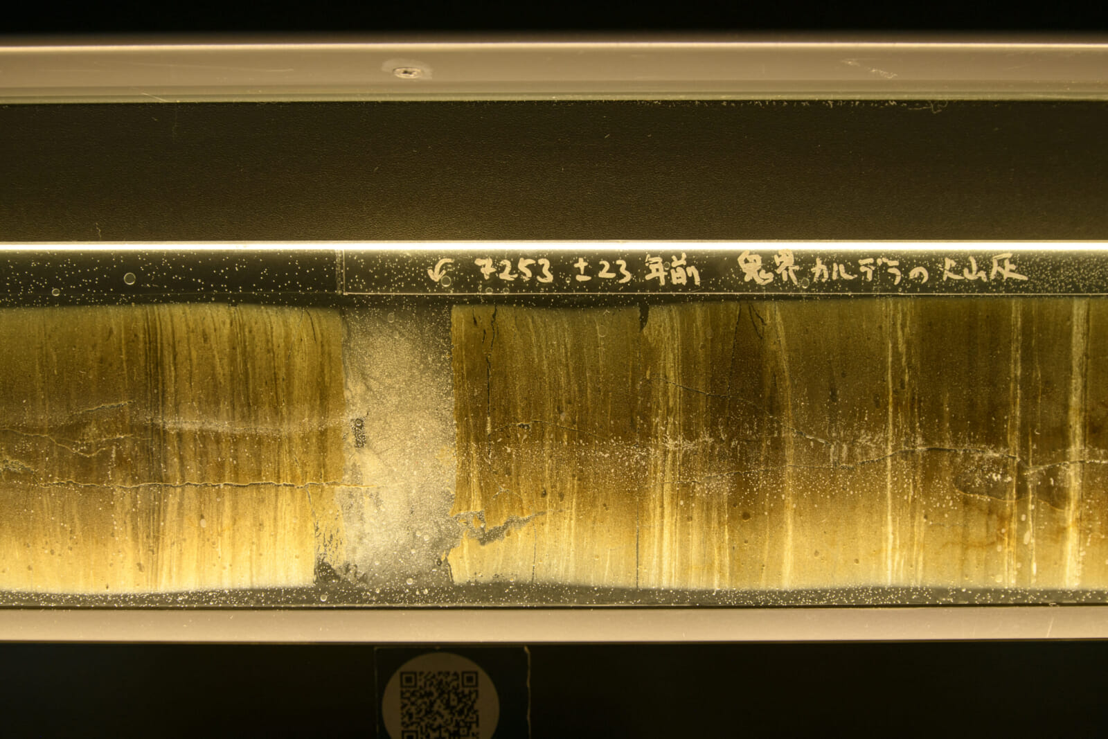 Full-size varve samples, carefully excavated from the lake bed, are displayed throughout the museum and backlit so they can be seen clearly. Examining them closely, viewers will note that they’re occasionally sprinkled with thicker lines than others. This can indicate a disaster of some sort, which led to multiple years of varves becoming disrupted. Depending on factors such as coloration and texture, researchers can know the type of natural disasters and when they happened. Not only is the precision of this process extremely accurate, aligning with historical records of major earthquakes or volcanic eruptions, but it goes far beyond the historical records of humans, providing unique data that can only be found in Fukui.
