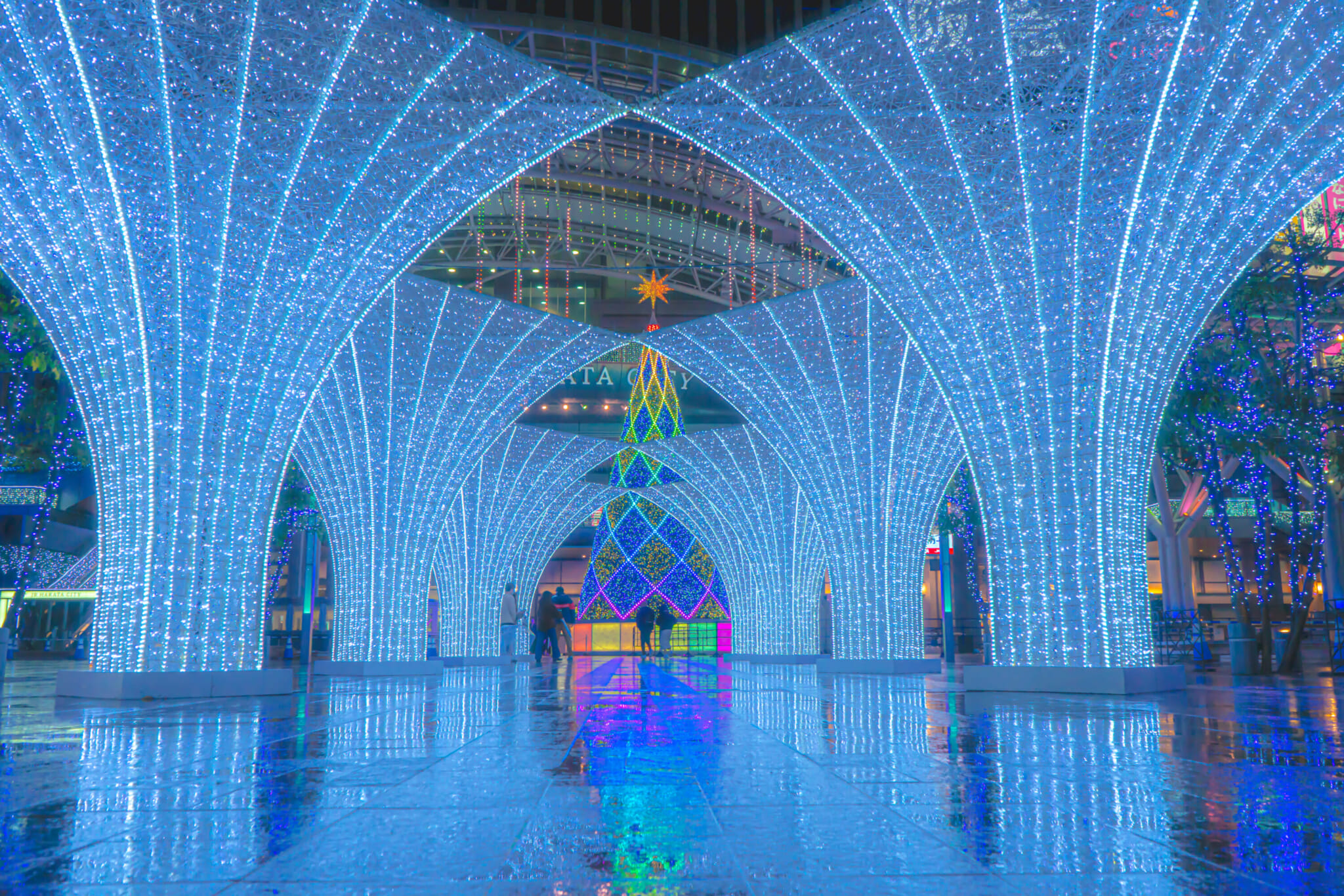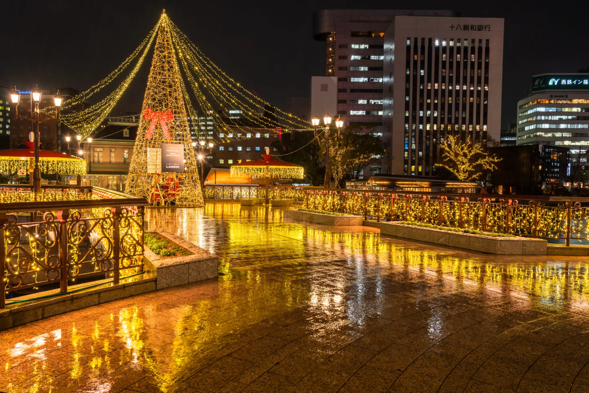 Key spots to see illuminations in Fukuoka city include JR Hakata City and Fukuhaku Deai Bridge, where twinkling lights wrap around the modern architecture and an elaborate Christmas tree takes center stage. Canal City, a massive shopping and entertainment complex, features spectacular light shows synchronized with music as well as a “River of Light” that spans the canal’s entire length.