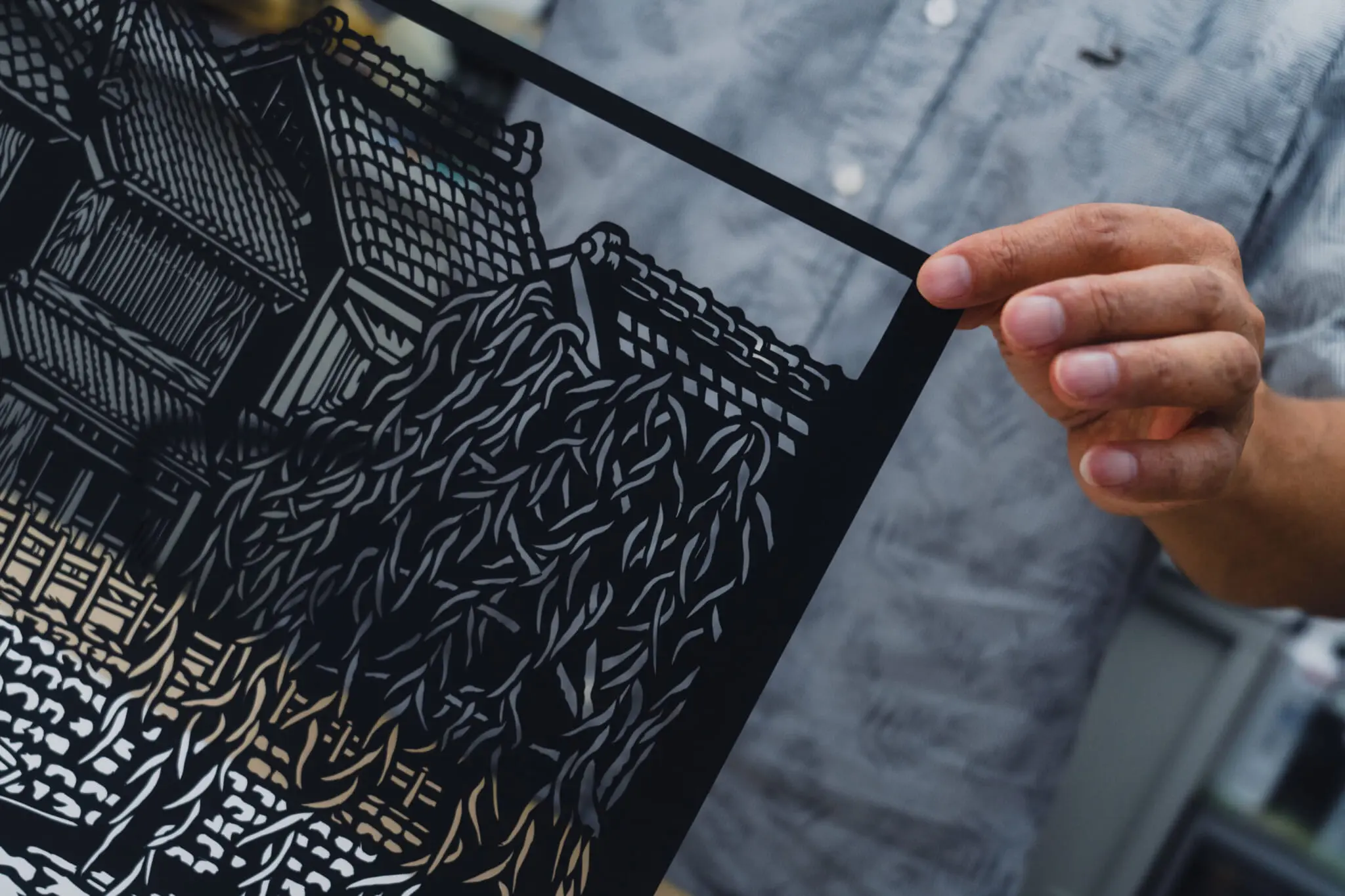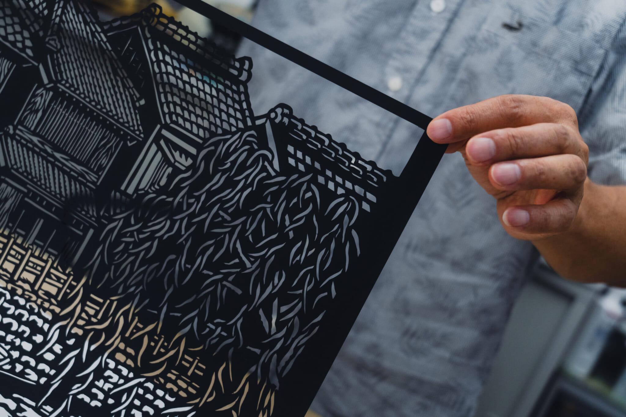 His creative process is deeply personal and painstakingly detailed. Noguchi describes the method: “I [create] a draft first, and I try to make sure everything stays connected — because if it’s not, the pieces will fall apart.” Working with precision, he cuts each piece using only a small knife, turning intricate sketches into layered compositions. Some of his larger works can take months, with every detail requiring focus and patience.