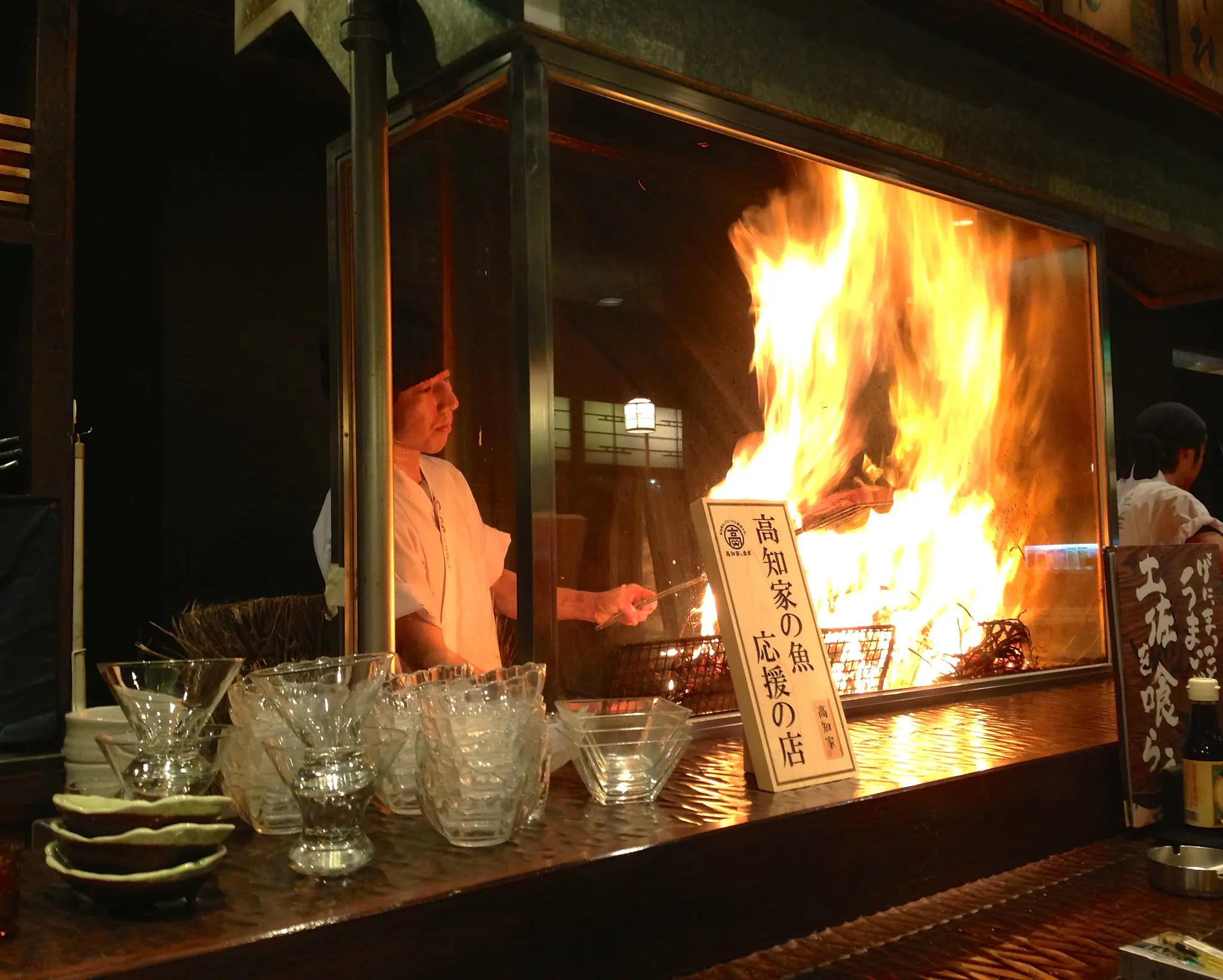 Warayaki is an ancient Japanese grilling technique that uses a straw-built fire. The technique comes from Kochi Prefecture, where bonito is seared over an open flame to create a grilled sashimi called katsuo tataki. Warayakiya Akasaka aims to spread Kochi’s warayaki cuisine with authentic Shikoku dishes. The house specialty here is, of course, the katsuo tataki. Because straw burns at a high temperature of 800 to 900 degrees, it yields a deeply smokey and fragrant finish; while the outside of the bonito develops a seared crust, the inside of the filet remains raw. After searing, the fish is seasoned simply with salt to preserve that flame-grilled taste.