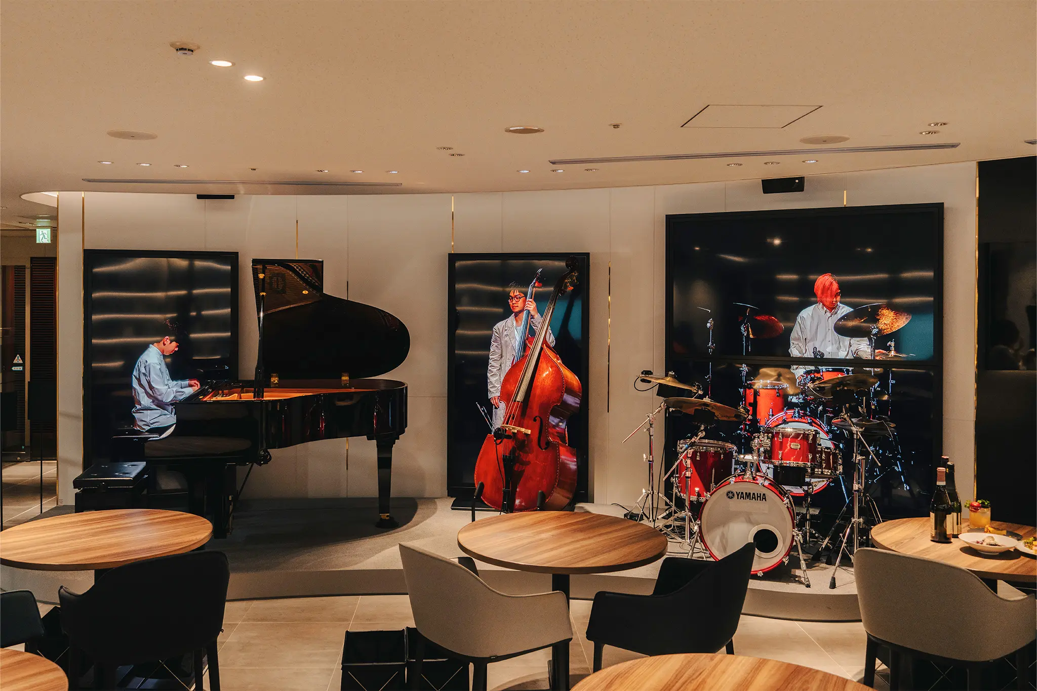On the stage sit a piano, a double bass and a drum kit. During each virtual set, the piano keys move just as though someone is touching them, the bass resonates with real notes, the hi-hats hiss as the snares sound. Life-size, translucent screens behind each instrument show the original, real human musicians, playing their instruments just as if they were in the room. Between sets, the instruments stand poised, ready to awaken every 30 or 60 minutes, depending on the schedule.