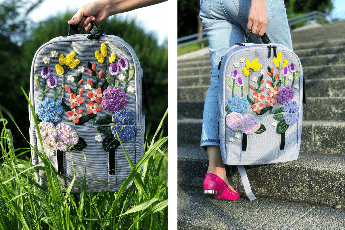 My most recent one. I was invited to collaborate with LOJEL, a global luggage brand aimed at modern travelers. Inspired by the season, I stitched a spring garden on their Urbo 2 Citybag. My garden features gladiolus, goldenrod, tulip, hydrangea and jasmine. Five different flowers, each with their own meanings such as strength of character, appreciation, growth and purity. In a Javanese wedding, it is also common to use fresh jasmine flowers in the bride’s headdress. The social campaign was to promote self-love and mental health, so I came up with a concept that included empowering flowers and strong symbolism.