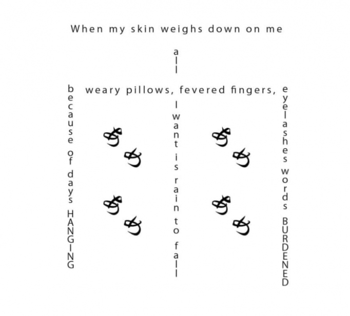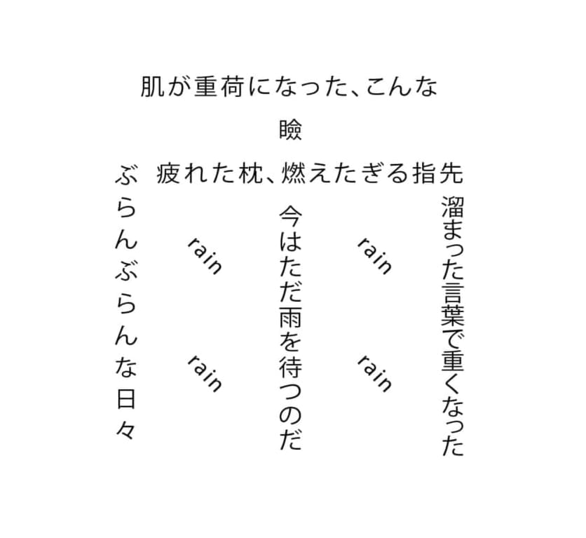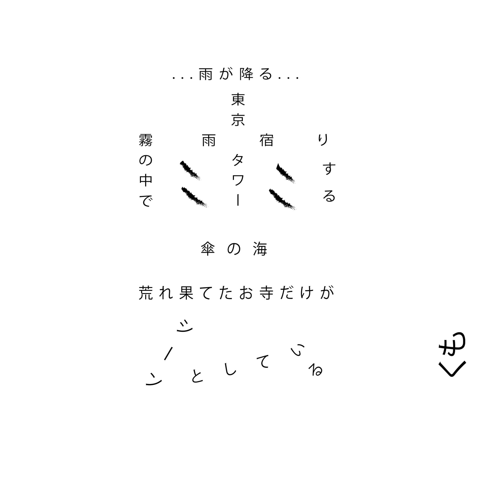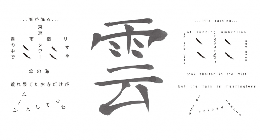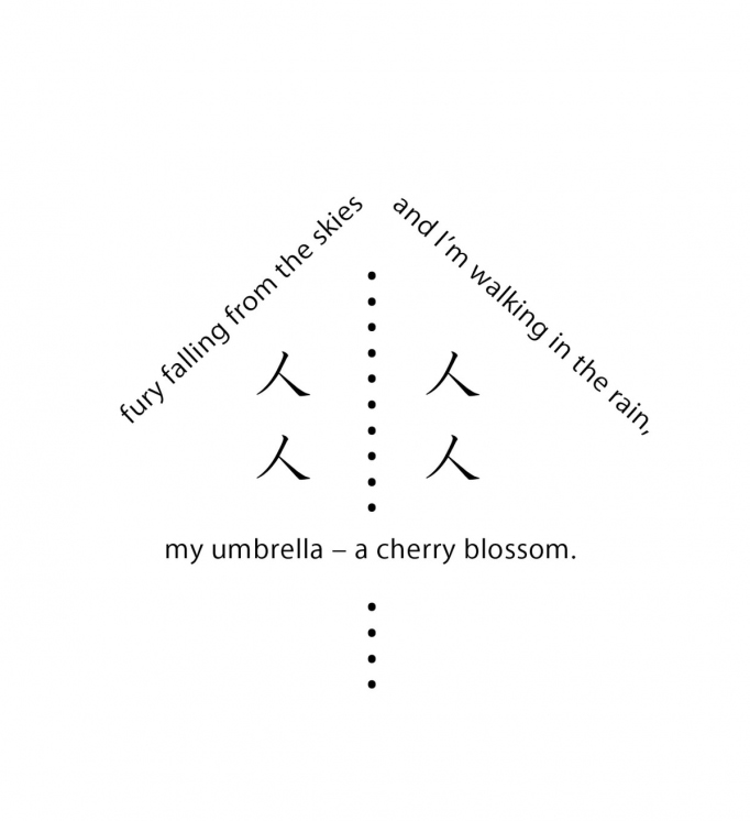 The kanji poems have a reading order which follows the stroke order when you write the kanji character. The author has encouraged readers to read out of this order too, as new meanings may come out. Besides the order, placement of words is also crucial, as words like ‘hanging’ and ‘fall’ appear in the bottom part of the poem.